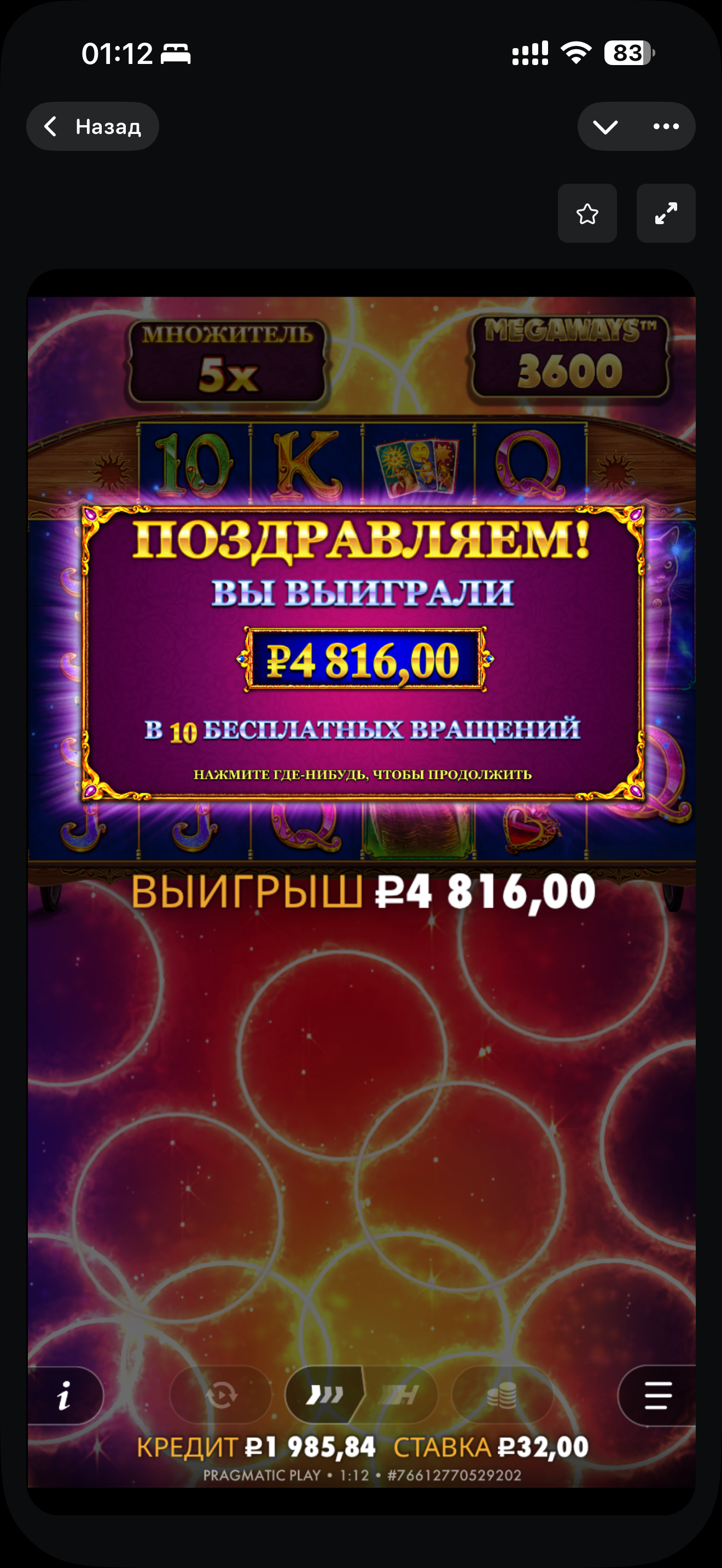 Всем привет! Выбил Бонуску с madam destiny megaways. Выпало 5х множитель и 10 спинов. Первый спин и вижу сенсация, не понимая, что сыграло. Оказывается, сыграла полная линия десяток, плюс было 2 вилда на х2, и спин дал 4800 рублей. К сожалению, после этого был всего 1 игровой спин, который дал 16 рублей, но все равно в выбитой бонуске получить 150х с первого спина очень даже приятно. Итоговый выигрыш составил 4816, чему я был очень рад. Всем желаю заносов!!!