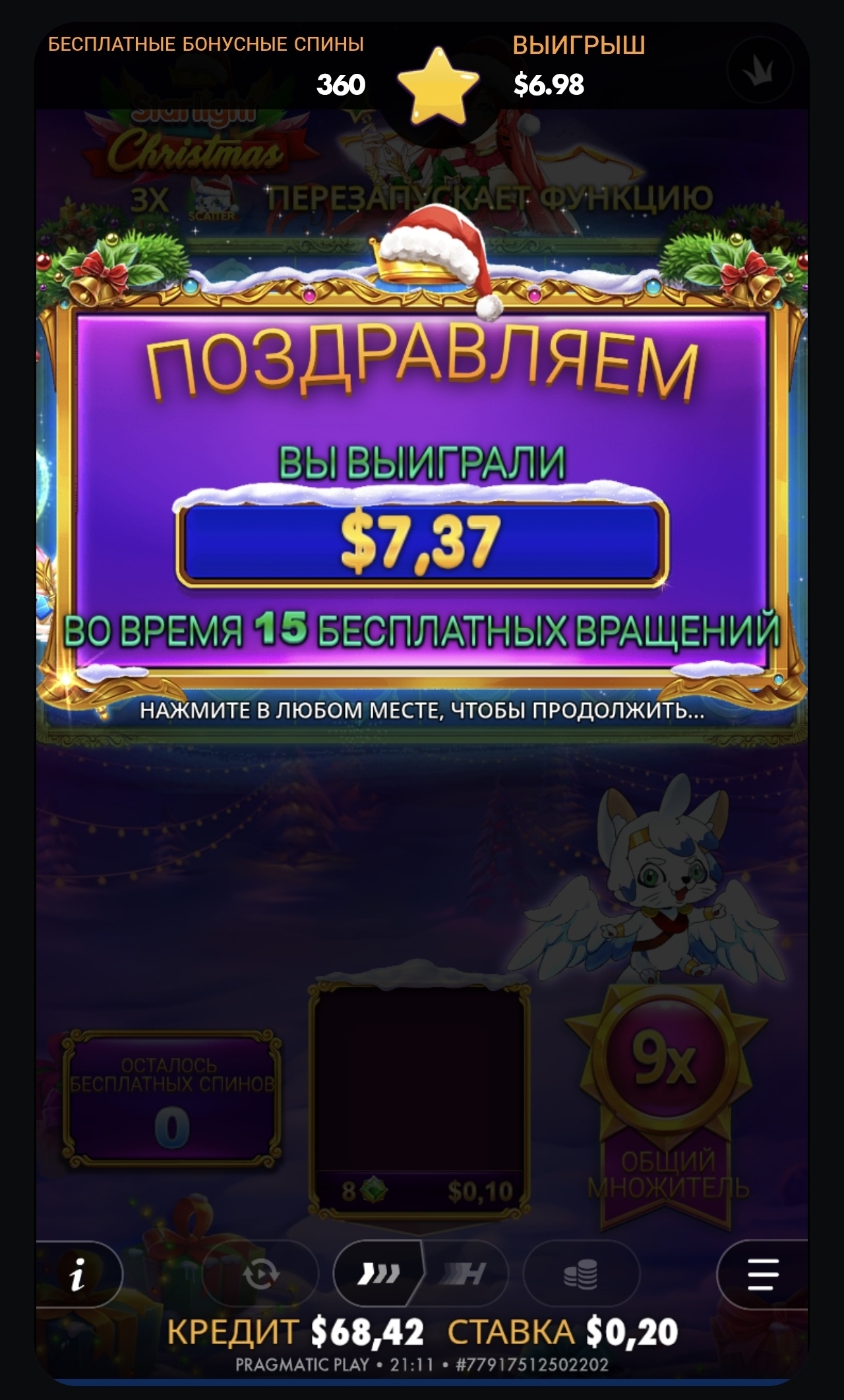 Стало интересно, как играют фриспины в слоте Starlight. Зашла в обычный сыгровок — нету, про бонуску даже не говорю. 100 спинов без игры и иксовок, потом перешла в Christmas версию, играло чуть лучше и выпала бонуска. Результат на скрине, 40х. Задаюсь вопросом: эти спины, с которых выбивают бонусы, дают больше 100 иксов или все так скручено, что надеяться не стоит, а крутить лучше там, где будет окуп?