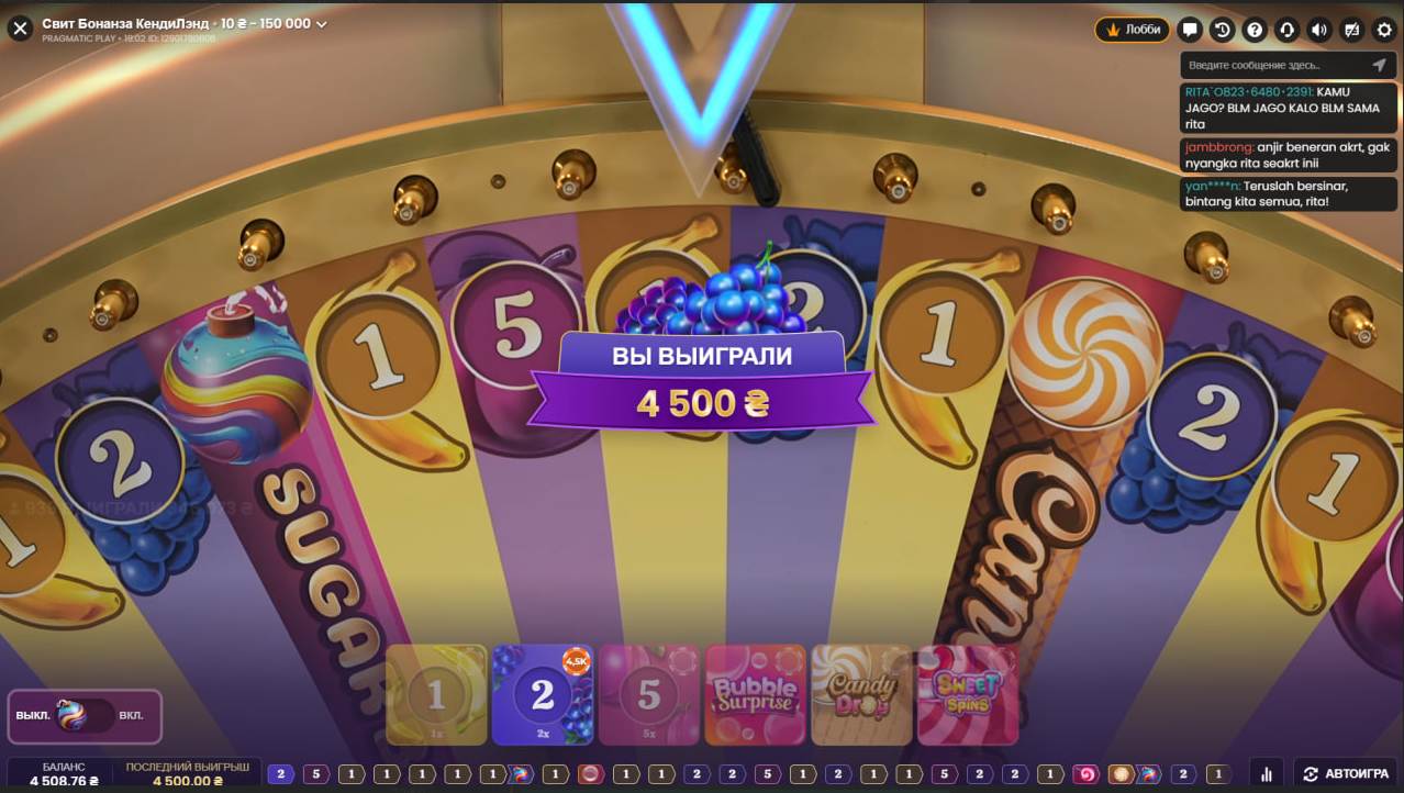 Решил после депозита сразу идти в sweet bonanza candyland и ставить алл ин, но успел поставить только на бонуски и очень повезло, ведь выпала единица, после этого 1500 грн поставить на 2, чудо произошло и на мой баланс залетело 4500 грн, очень приятно когда ва-банк работает