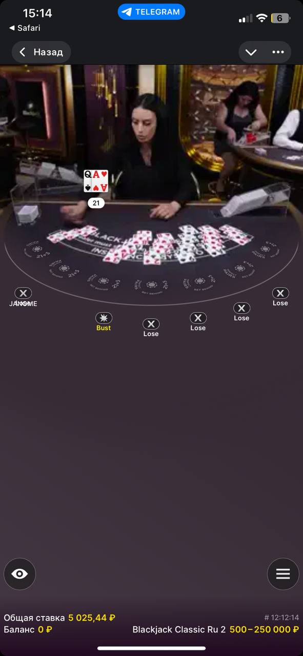 Я сел в неком отчаянии за случайный стол в блэкджек с русским дилером, поставил алын- весь свой баланс, 5000 рублей. Карты раздали просто отвратительные. Ведь мало того, что я перебрал, в конце партии, когда пришло время вскрывать карты дилеру, у него вообще оказался туз, равно блэкджек. То есть шансов выиграть у меня изначально было 0 без палочки. Нет слов.