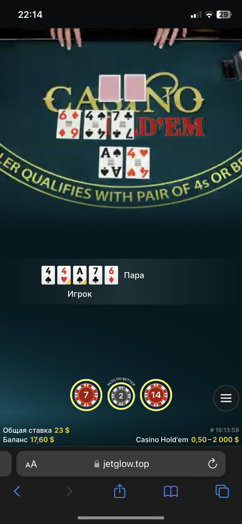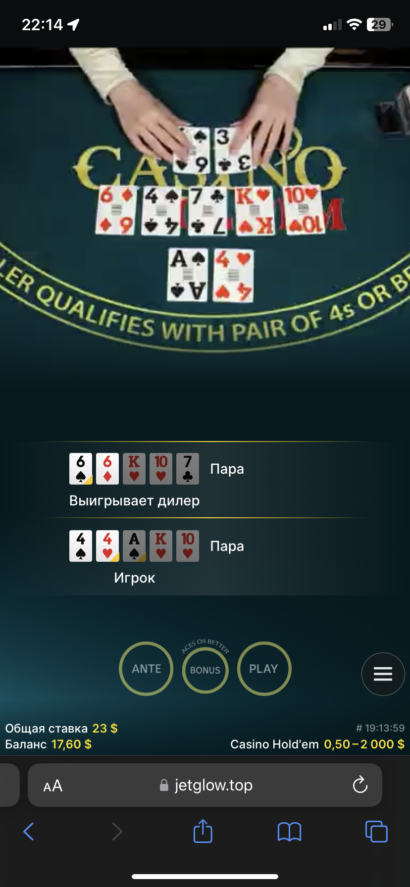 Так, тут мне удалось поймать пару четверок и неплохие карты на флопе. Играем. Но что же у дилера? У дилера пара старше — кикер шестёрка, и она же на общем столе. Что ни рука — то невезение какое-то..