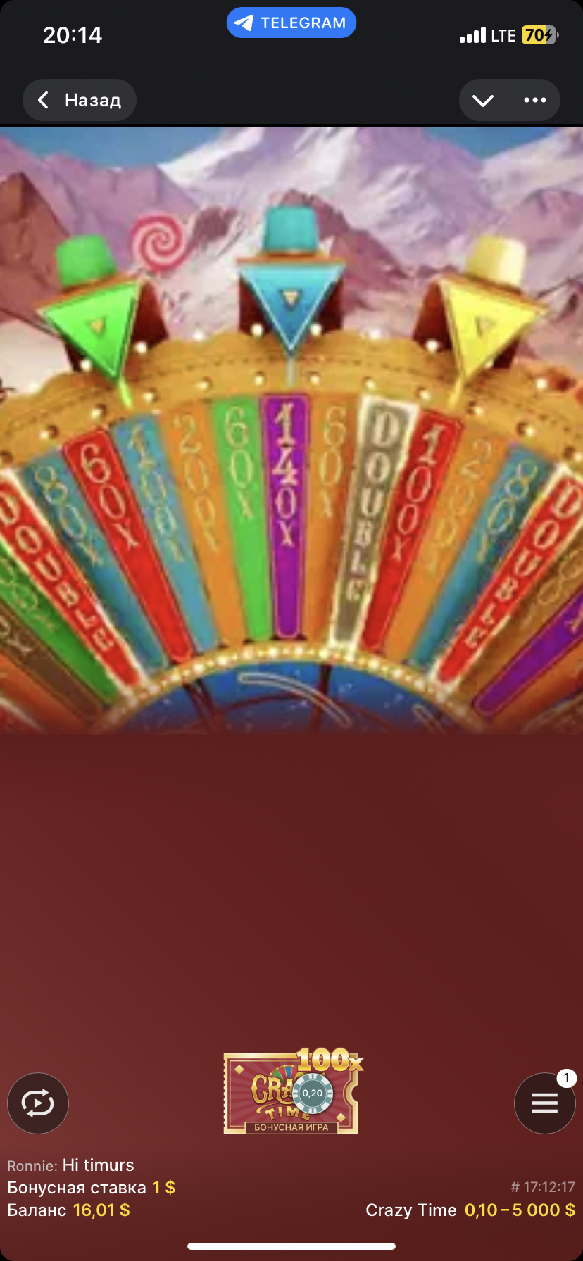 Играл в лайв Crazy Time от Эволюшина. Это очень старая игра, которая уже давно перестала хоть что-то нормально выдавать, пытаться ловить там что-то нет смысла. Но всё-таки меня занесло туда, и я умудрился поймать топовый бонус, в честь которого игра и называется, под 4х с топслота. Ставка, конечно, как всегда копейки.