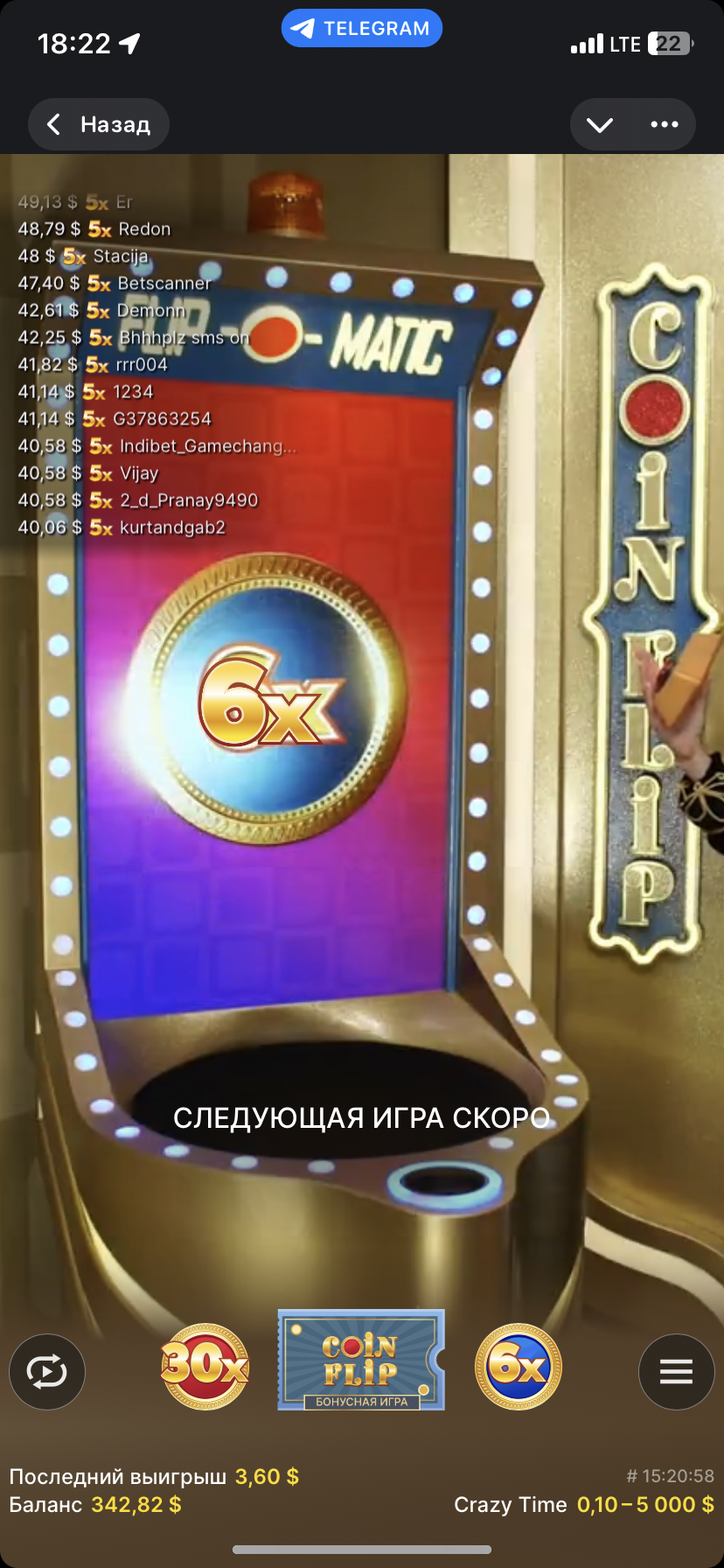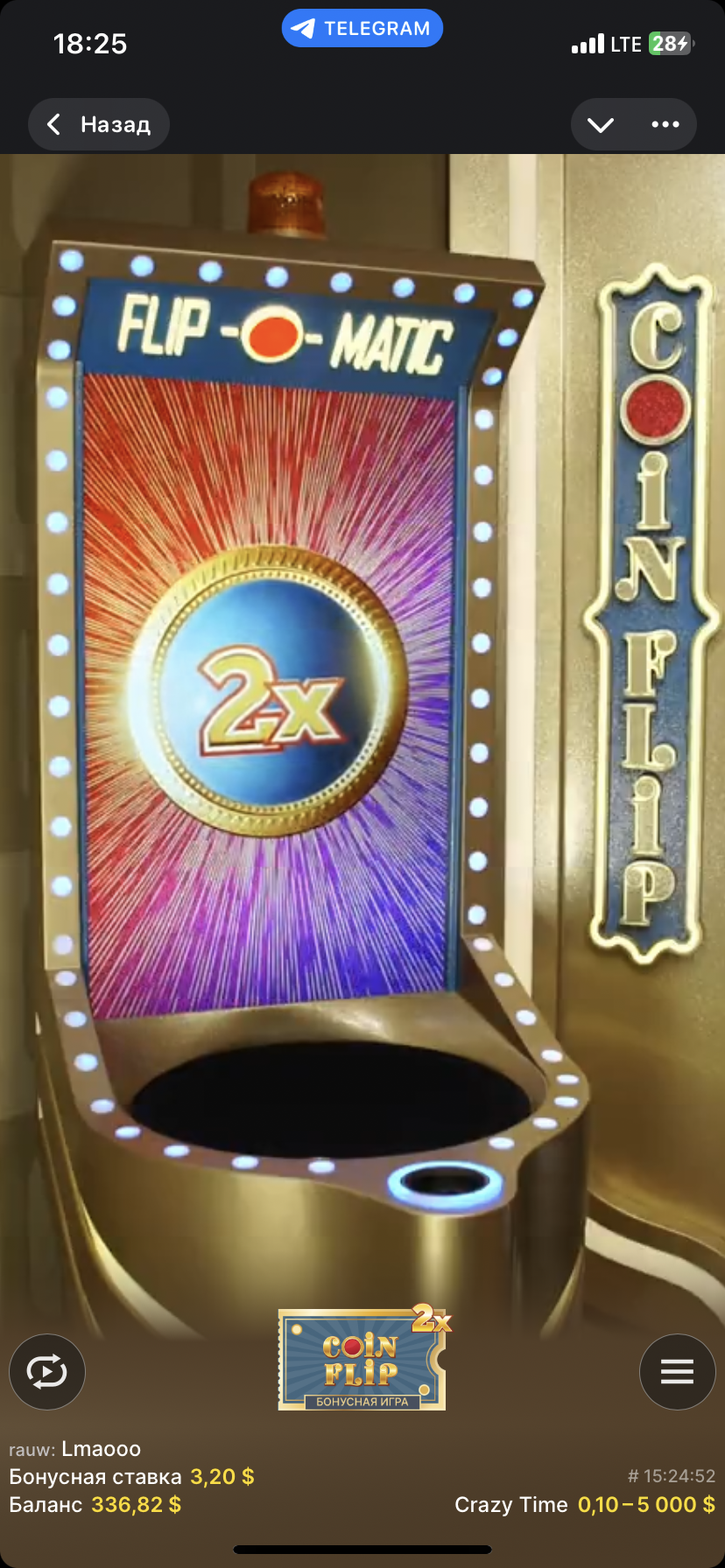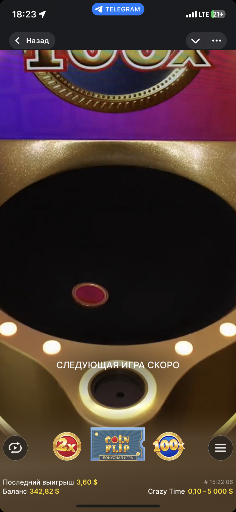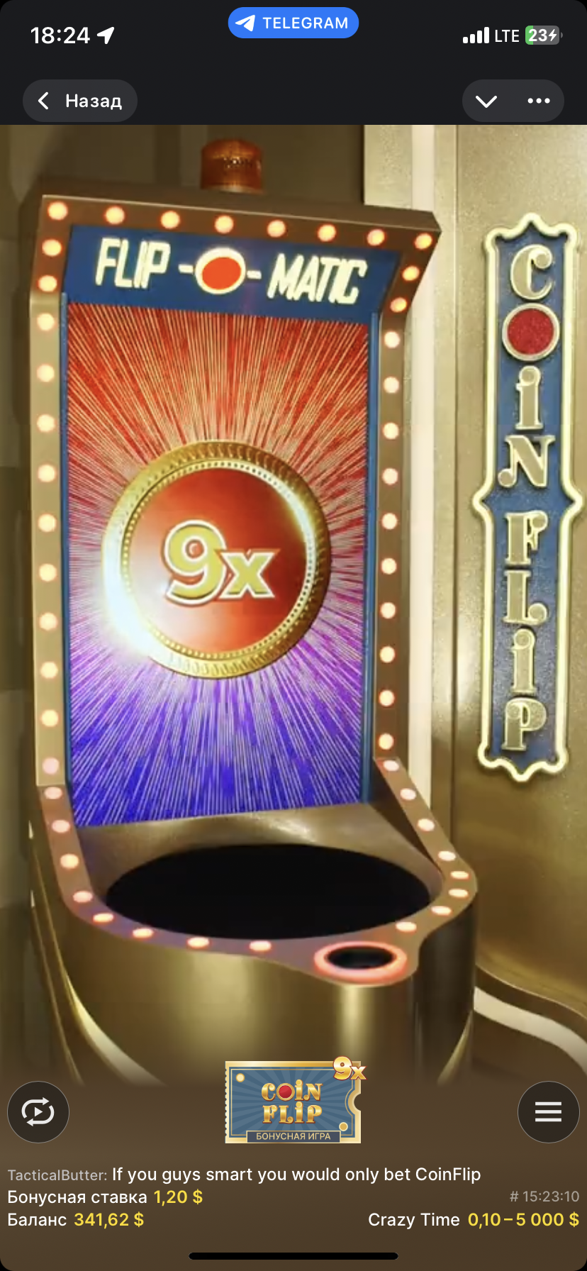 Снова Crazy Time, снова очередная сессия… Легендарное колесо с четырьмя разными бонусами, но на деле все они — коин флипы. Вот в такую ахренительную сессию мне повезло попасть: