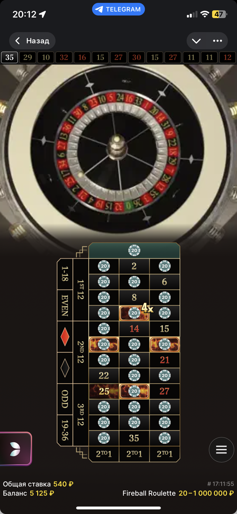 Я играл в новую игру Fireball Roulette от Evolution. Но вот он, тот момент, когда шарик начинает замедляться. Я затаил дыхание, сердце колотится, и вдруг он останавливается… на единственном номере 25 с бонусной функцией, на который я не поставил! Внутри все перевернулось. В этот момент мне кажется, что удача окончательно покинула меня, ведь такое уже не в первый раз! Самое смешное, что бонусные номера выбираются случайно, а не везёт будто целенаправленно