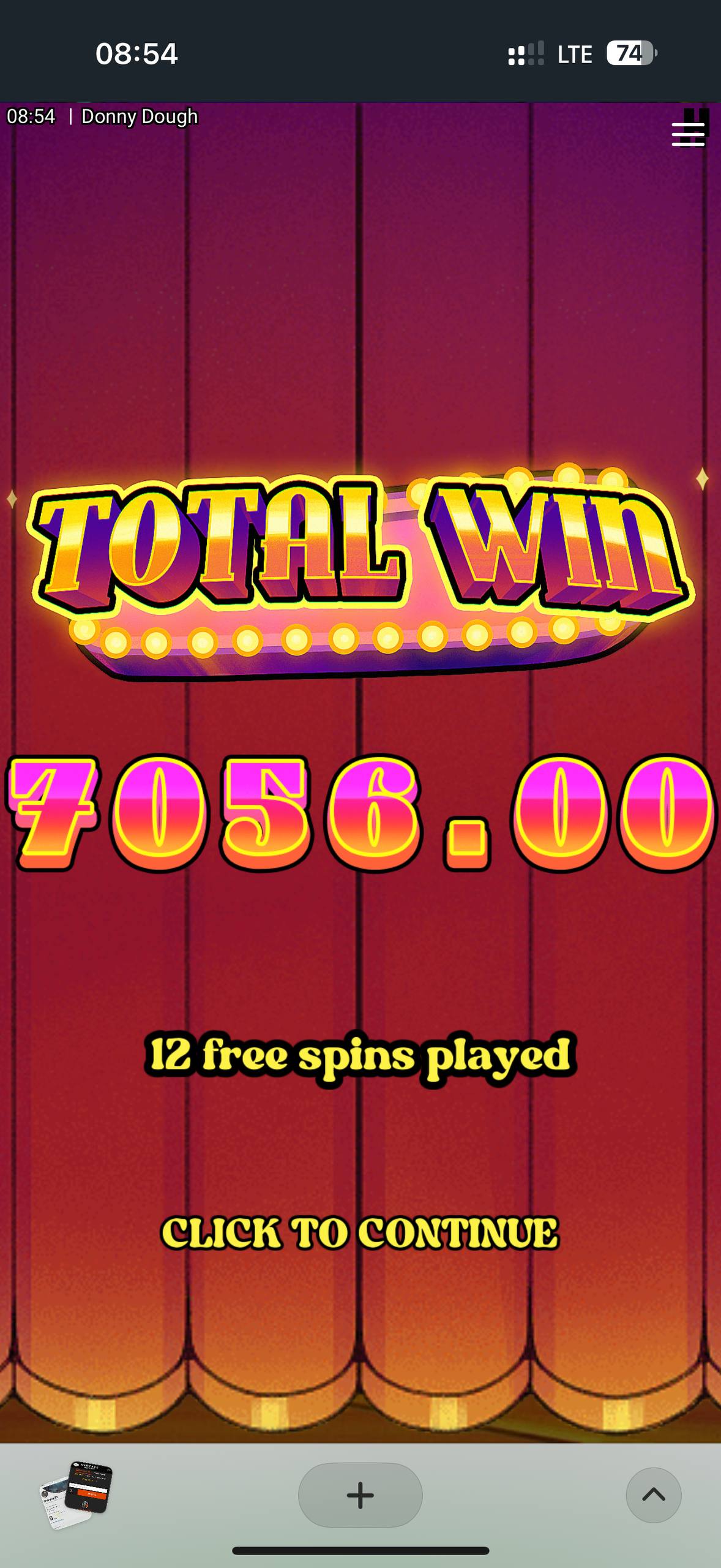 Всем привет! Следующим слотом я решил посетить Донни доуг. Тут я уже решил понизить ставку и взял бонуску за 8000. И тут моя череда выигрышей закончилась. Бонуска, конечно, почти окупилась, и дала 7000, но я думал «а вдруг максвин». Но к сожалению ничего не дало, хотя даже дало негарантированную шляпу. Всем удачи!