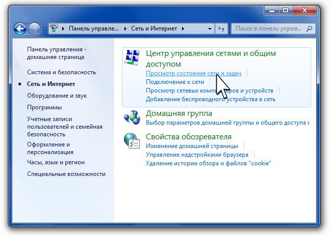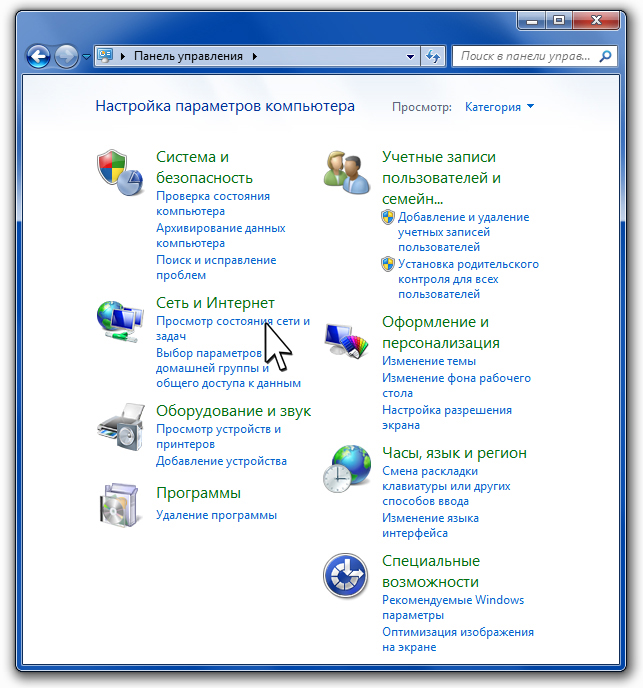 - Откройте Панель управления. Выберите отображение информации по категориям. Далее категорию «Сеть и интернет», где следует выбрать «Просмотр состояния сети и задач».