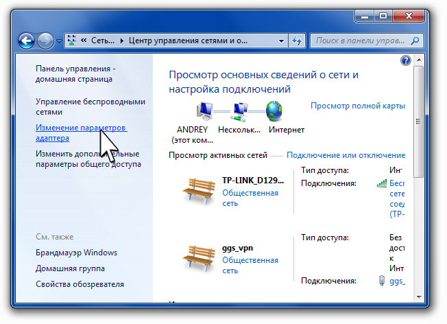 Просмотр состояние сети и задач - Далее нажимаем на ссылке «Изменение параметров адаптера».