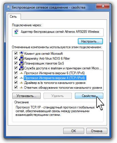 Свойства подключения - Далее надо нажать на «Свойства» протокола интернета версии 4 (IPv4).