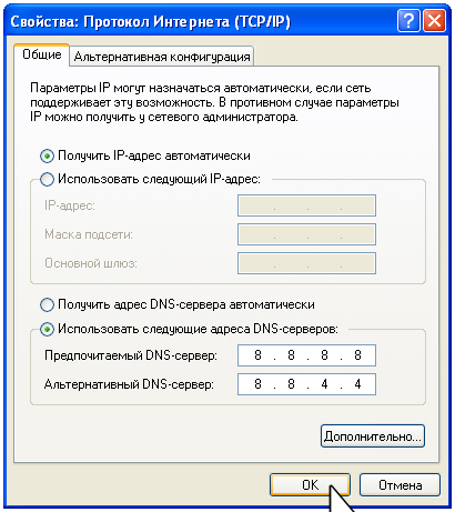 Настройки Альтернативного DNS-сервера для WINDOWS XP