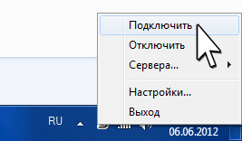 - Скачайте программу VPN по данной ссылке. Когда программа скачается, сохраните ее в быстро доступном месте на компьютере. Нажмите на нее 2 раза левой кнопкой мыши. После чего в трее (в правом нижнем углы монитора, рядом с часами) появится иконка программы, с красным значком. Кликаем правой кнопкой на иконку и выбреем там «Подключить». Идёт подключение к серверу-vpn. После чего значок программы должен стать зелёным. И… всё! Можете запускать свою любимую игру.