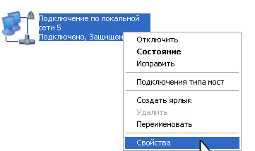 Сетевые подключения Windows XP - Выбрать «Свойства» используемого на момент работы подключения.