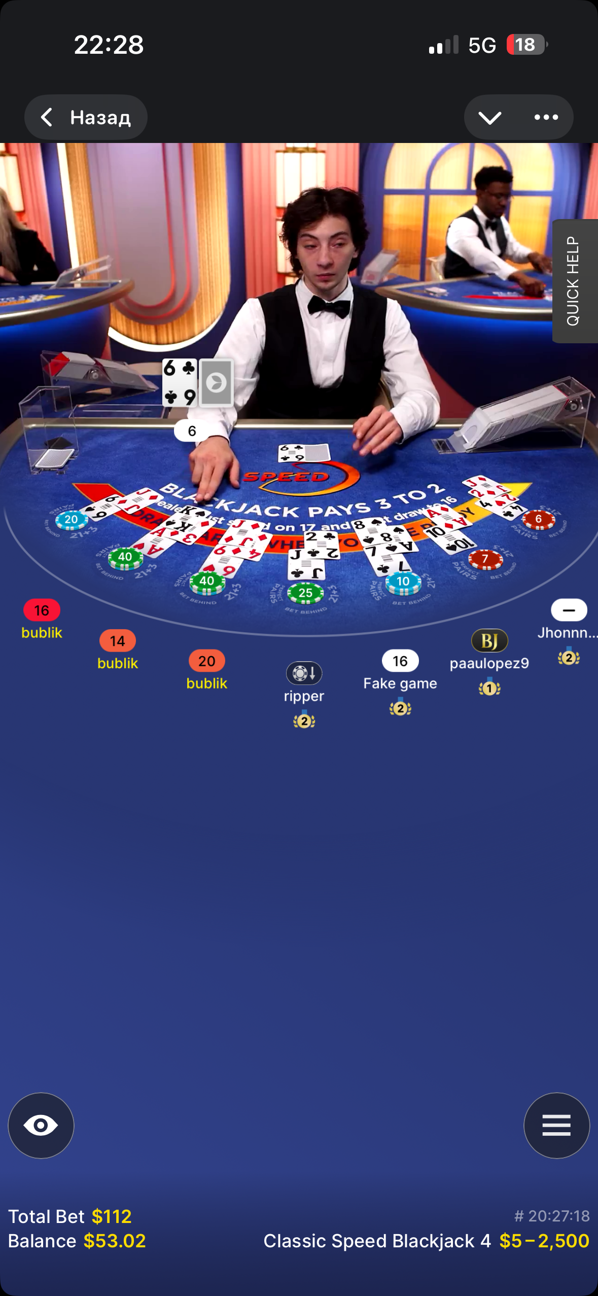 Зашел вечером поиграть в блэкджек. Ничего необычного, просто 3 руки занял, поставил по 20$ на основную ставку, и по 2$ на бонусные. На первой руке мне дало 6 и 4, на второй туз и 3, на третьей 6 и валет, дилеру же дало 6. Я сразу сделал дабл на первой руке и мне дало 10, в итоге 20. решил рискануть и на второй руке, так как у дилера 6, и большой шанс на перебор, в итоге у меня 14, на третьей руке решил оставить все как есть и просто надеяться что дилер переберет.