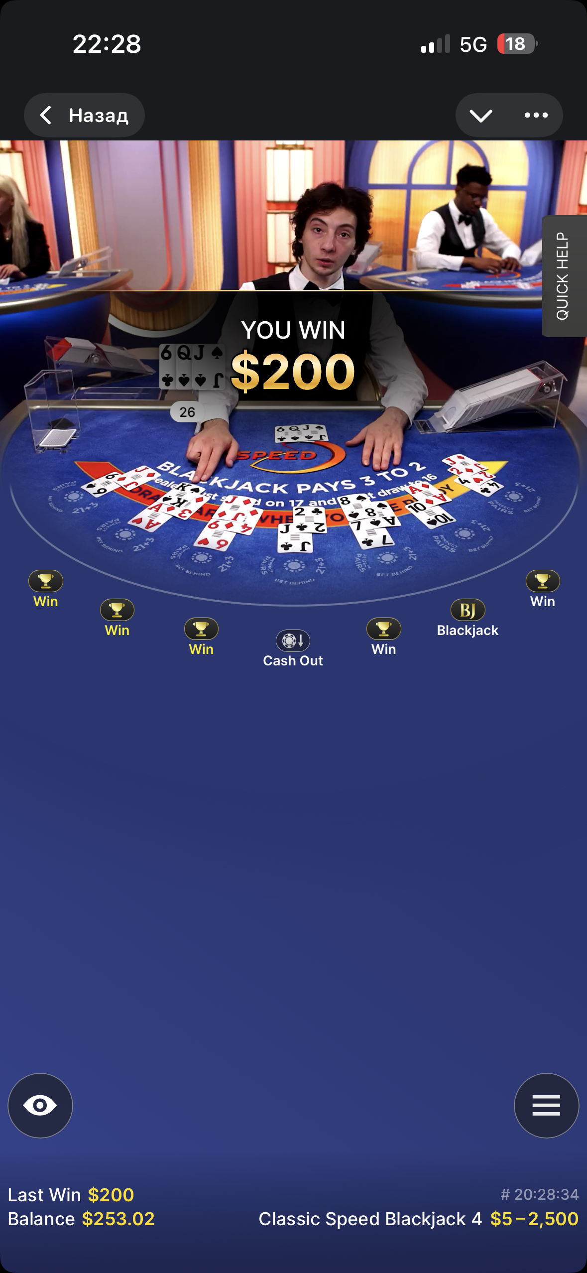 Он достает вторую карту 10, и тут любая карта выше 6 — победа. он добирает 10 и у него перебор, я выигрываю 200$, благодаря 2 даблам.
