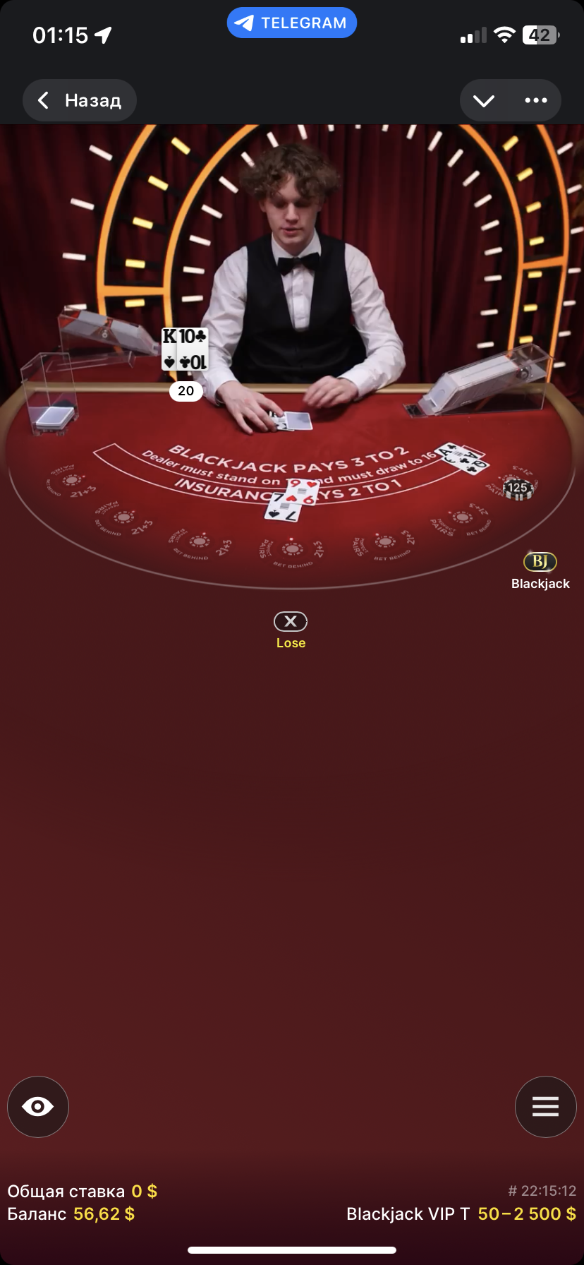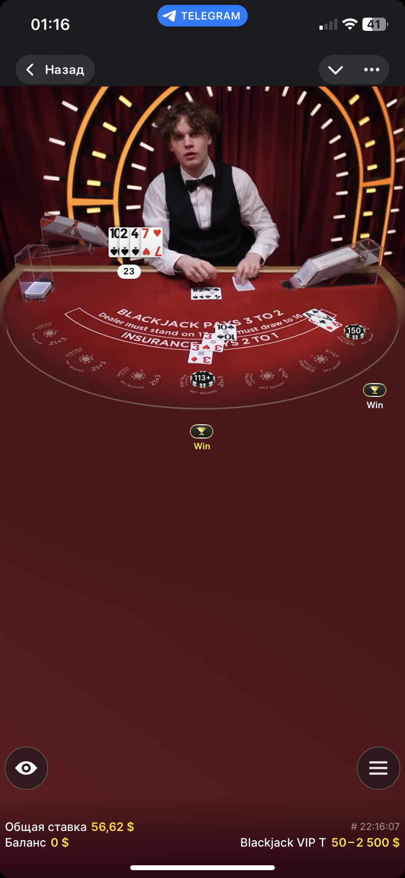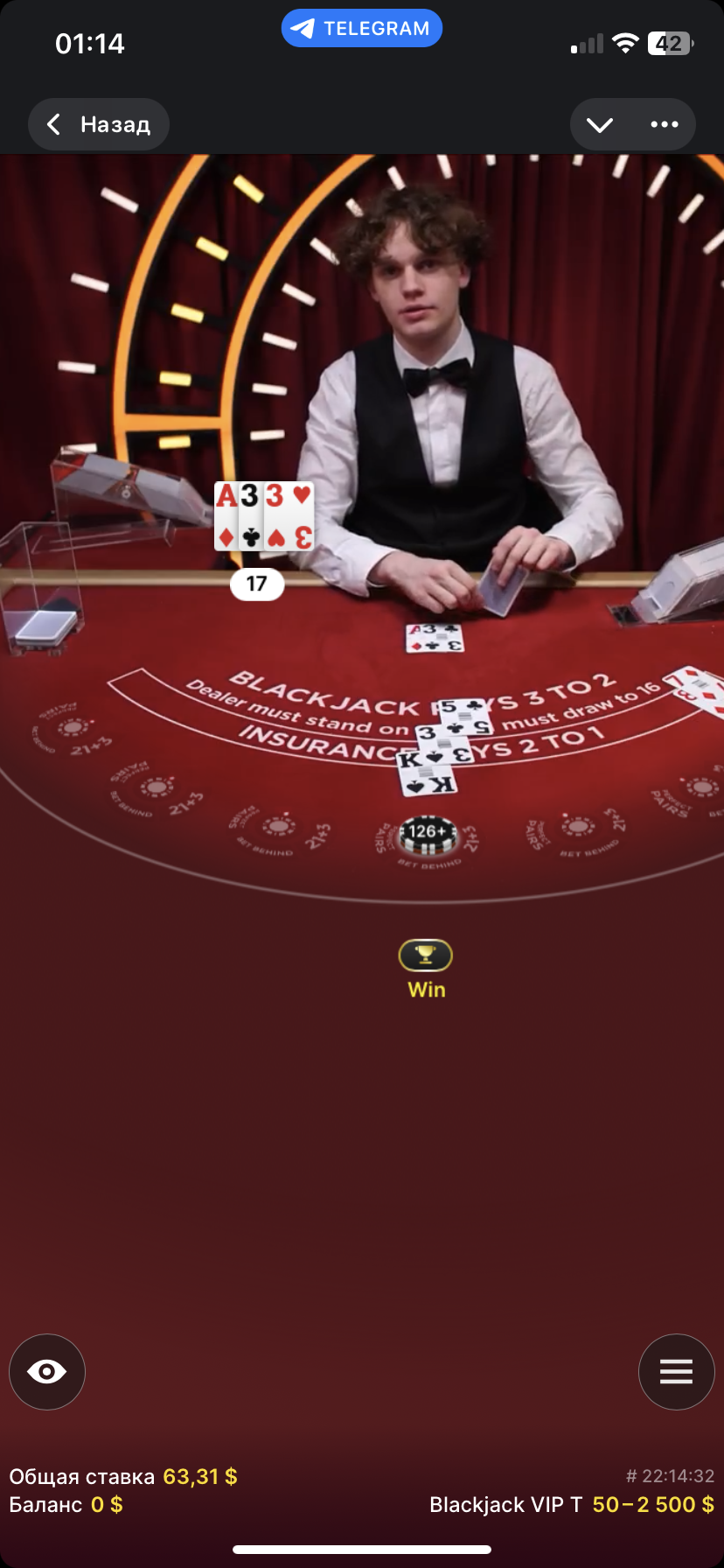 В этот раз я решил all-inиться за вип столом в блэкджеке, где минимальная ставка 50$. Поставил первую ставку — туз у дилера, 13 у меня… ну капец, блэкджек у него? Нет, повезло, однако со своим счётом нет, тут только добирать.