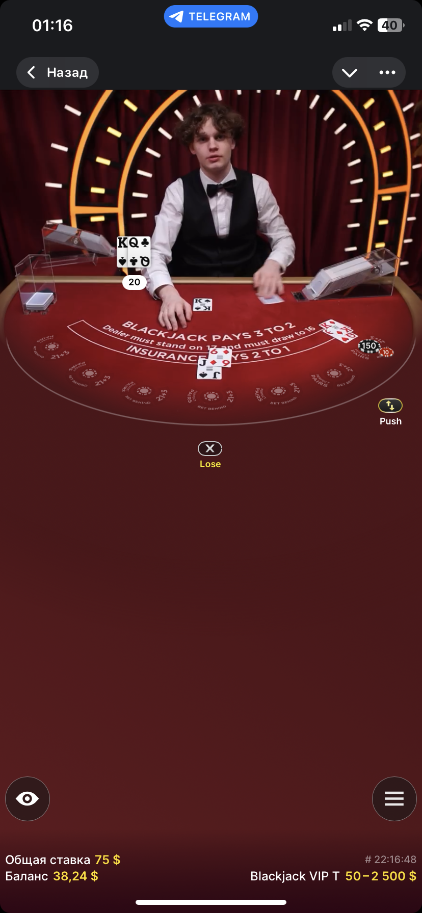 Ставлю последнюю ставку — если выиграю, будет камбэк депозита, но ОПЯТЬ у дилера 10, а у меня блин 16! Что-то этот стол вообще заклинило именно на 10 у дилера и 16 у меня.