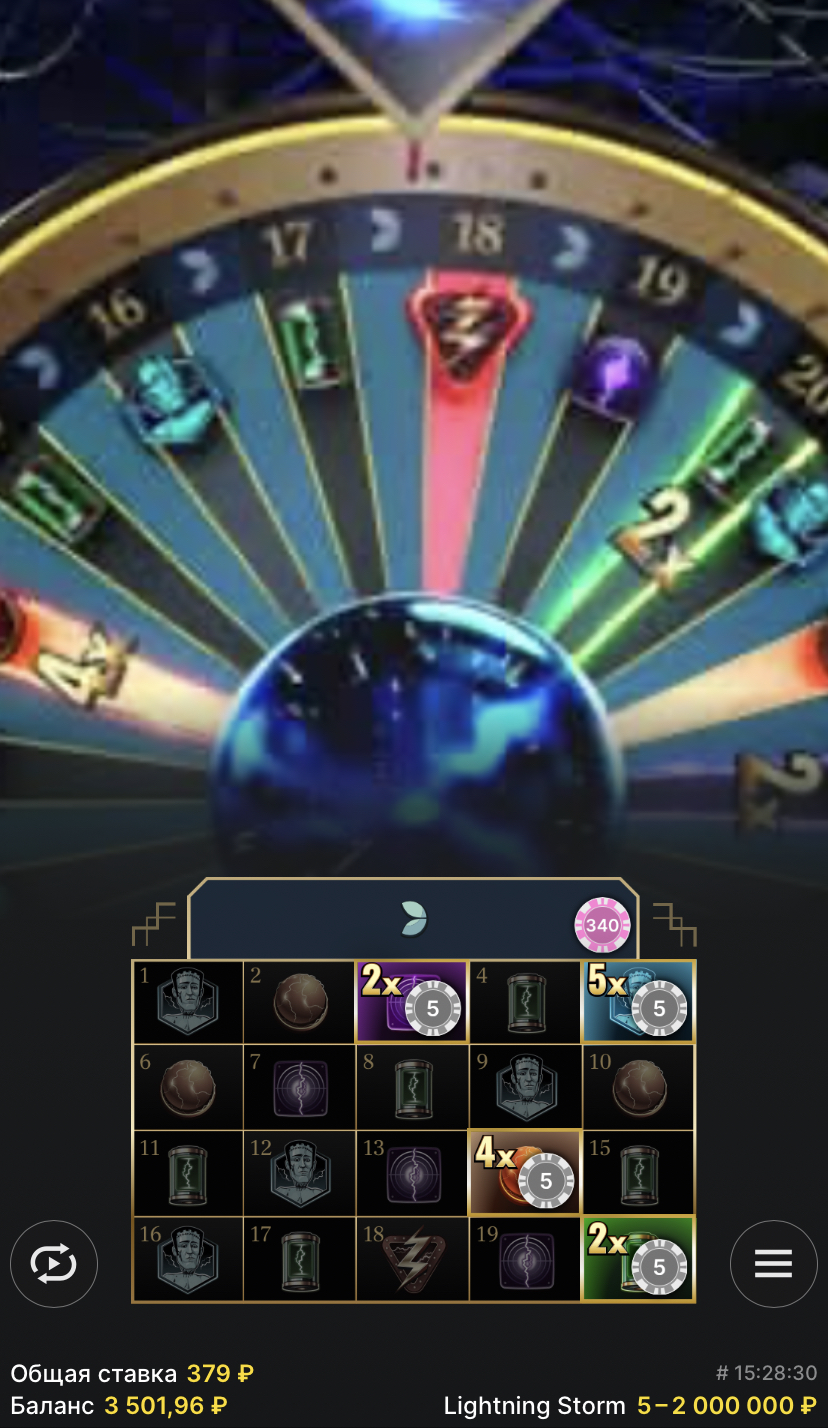 Время от времени вместо бонусов я ставлю на него, чтобы просто сделать х2 от ставки, и постоянно это получается. В последний раз я поставил 340 рублей на листочек, и мне нужно было, чтобы не выпала ни одна бонуска. Колесо уверенно катило на лучший и топовый режим в этой игре Lightning Storm, но всё-таки перекатило ради меня, чтобы я выиграл 680.