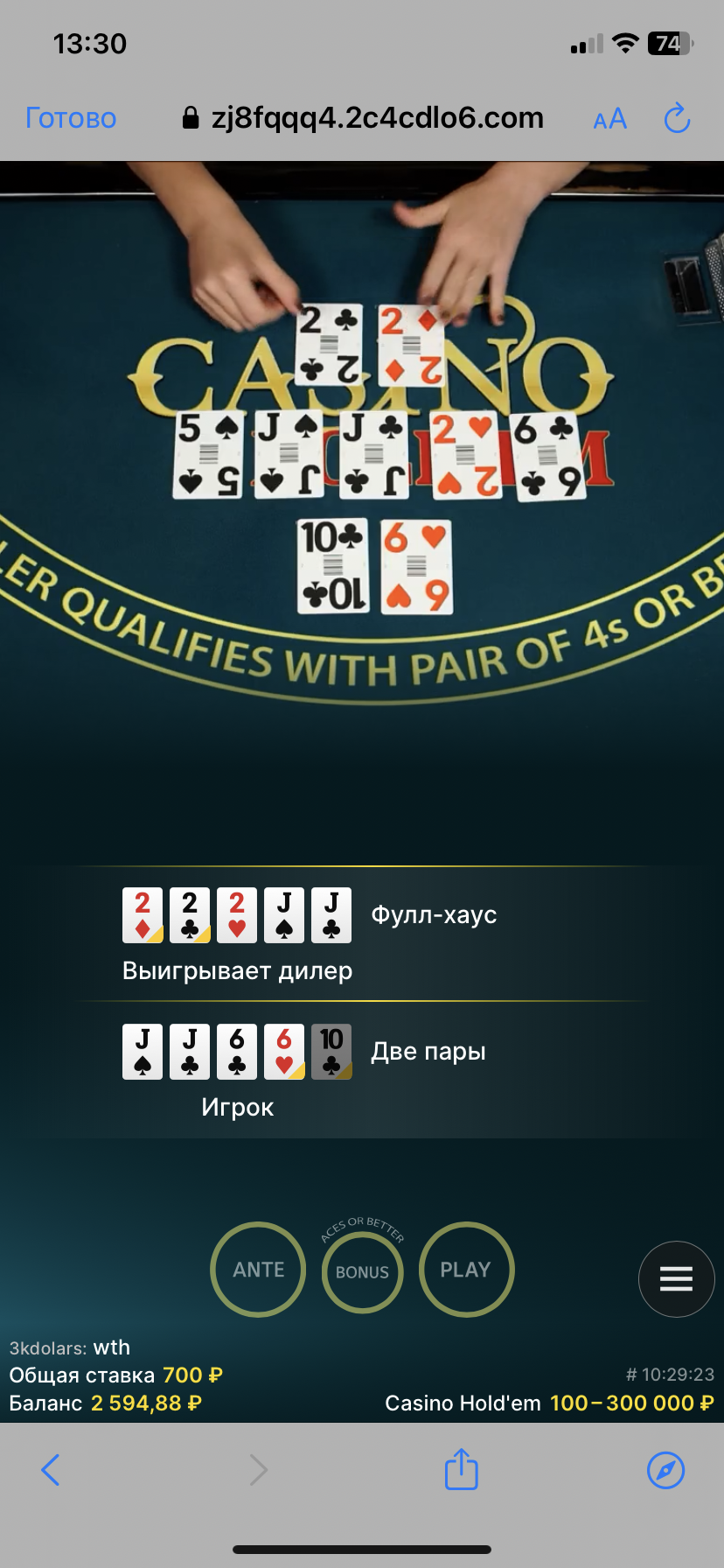Я играю в Holdem Casino от Evolution — просто обычная версия покера с дилером. Моими кикерами были 10 и 6, а со флопа — 5 и два вальта. Я решил играть, надеясь на ещё одну пару, и так и случилось — дилерша вытащила ещё 6, и у меня оказалось две пары. Легкая победа, как казалось бы, но у неё были карты 2 и 2, что привело к фул-хаусу у дилера. Никогда не знаешь, что у них там за карты, и как они могут мгновенно всё испортить…