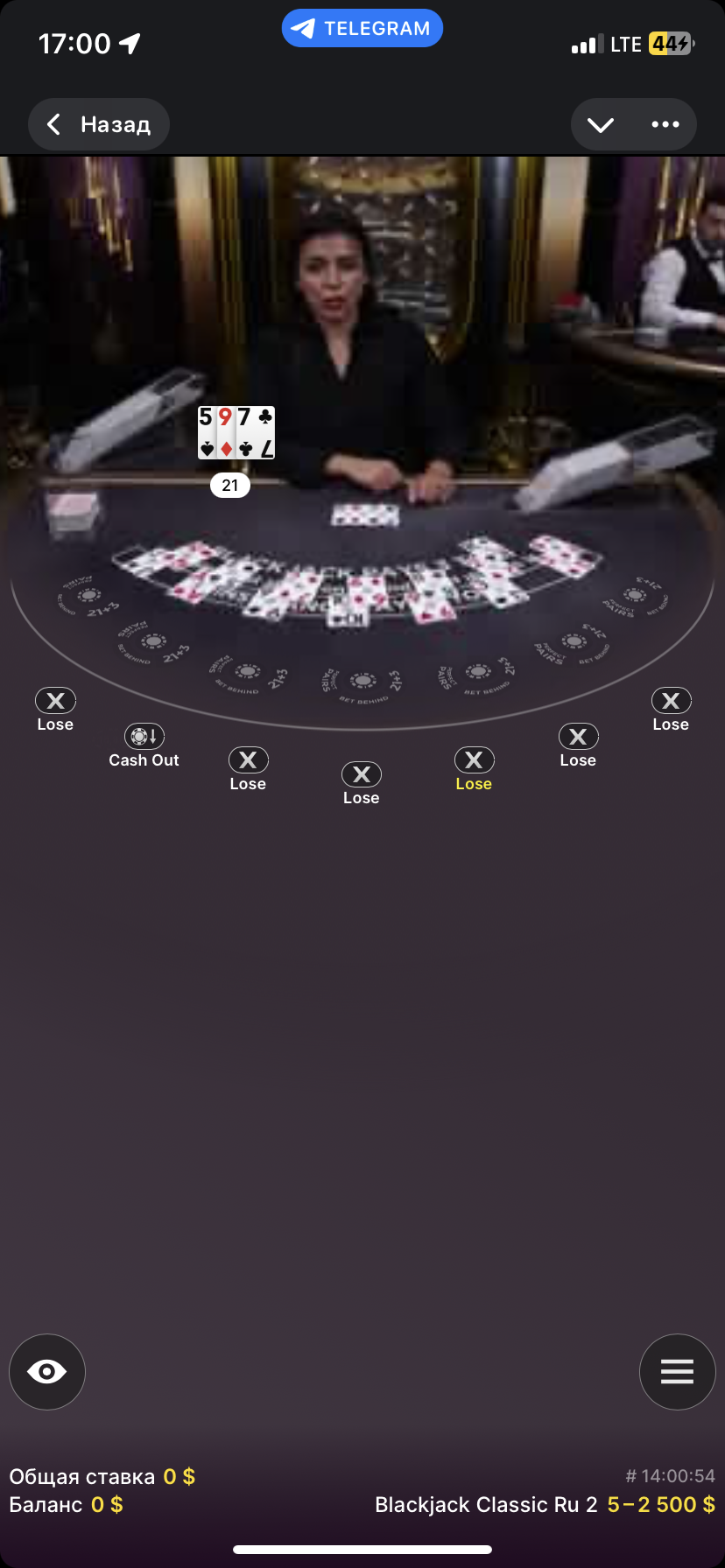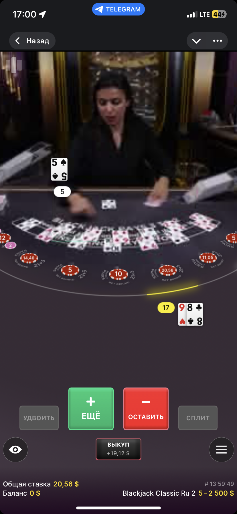 Первый зашёл хорошо и отлично, во втором у меня было 17. Дилер с открытой картой собрала 14 — шансов перебрать много, но в этот раз она рашила достать именно 7, чтобы собрать 21 и никто не выиграл.