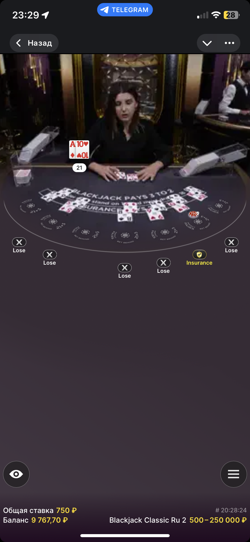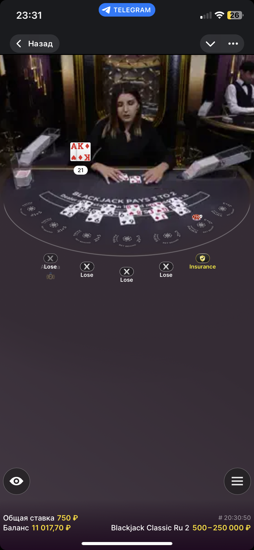 Вот и мне попалась такая колода, из которой дилерша достала туза. Я решил воспользоваться страховкой, хотя обычно никогда этого не делаю, и у неё оказался блэкджек, моя ставка была возвращена. Повторяю ещё раз — опять у неё туз, опять предложение страховки. Я решил использовать её ещё раз, но не верил, что опять у неё там десятка. Но, конечно же, в итоге блэкджек второй раз подряд.