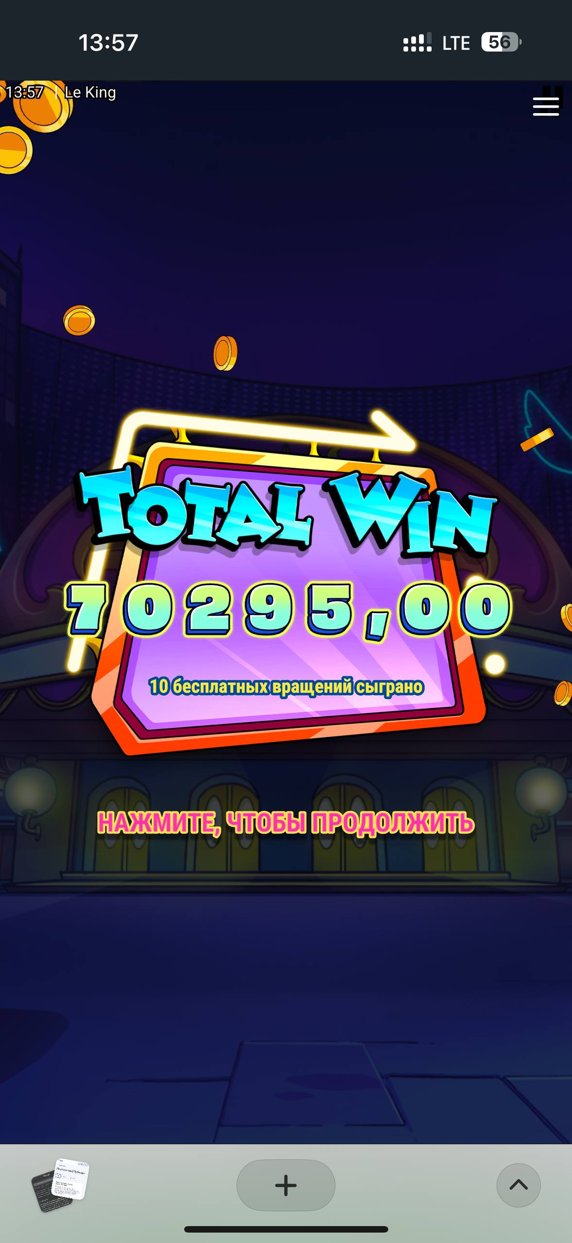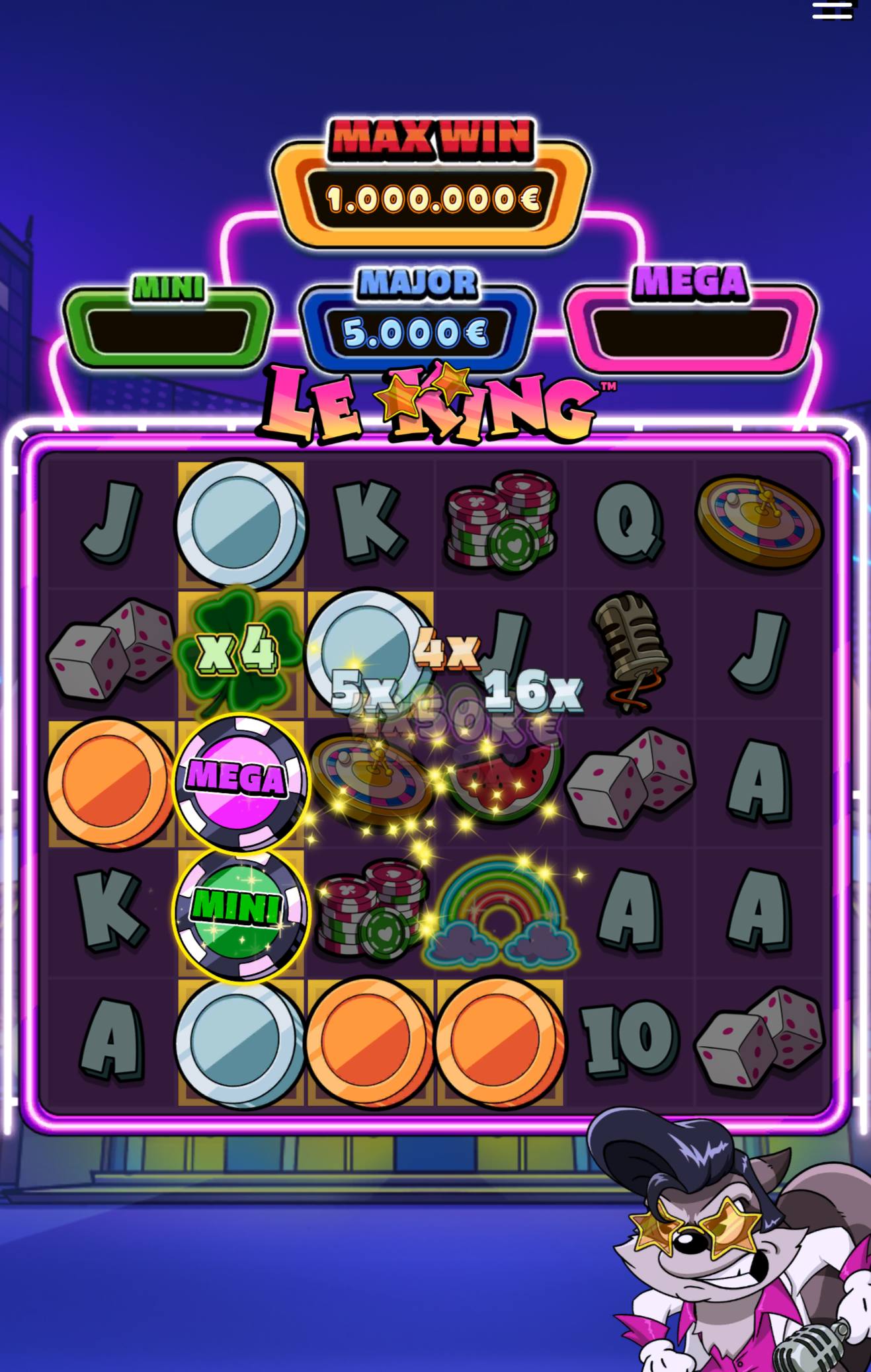Всем привет! Решил я, значит, зайти к ещё одному енотику и не прогадал. Вот он был очень рад меня видеть — Le King. Я взял в нём топовую бонуску за 10к рублей. Что мне нравится в этом слоте — это то, что в нём не одна гарантированная радуга, а две. Первая радуга дала не очень много, даже обидно, ведь сыгровка была только на 5 полей. Но следующая радуга уже очень даже порадовала, ведь упала монетка Мега, которая давала 50к рублей, чему я не мог не радоваться)). Спасибо енотику! Всем удачи!