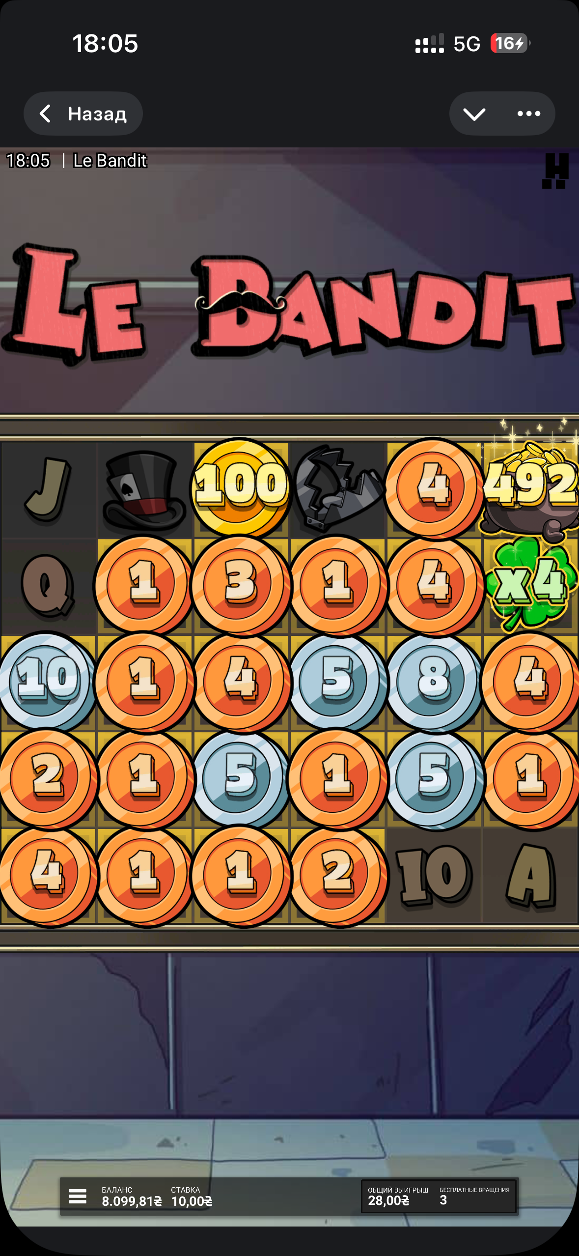 После прошлой заносной бонуски я решил остаться в ле бандите и уже решил попробовать словить бонуску в спине, по ставке 10 грн. И мне это удалось довольно быстро. С самого начала там все играло, и открыло довольно большую поляну, и на 4 спине дало радугу. И это было что-то с чем то, с прошлой бонуской в 3к х не сравниться, но выигрыш почти такой же…