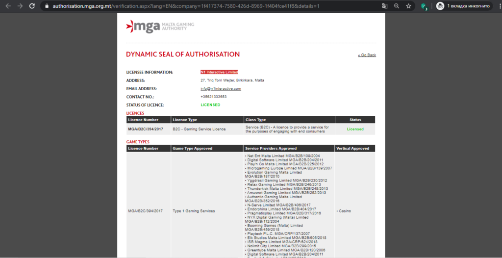 если казино лицензировано на Мальте, переходим в футор сайта онлайн казино и «тыкаем» на значок лицензиара. Сразу попадете на страницу валидации адрес в браузере будет выглядеть так: https://www.authorisation.mga.org.mt/verification.aspx?lang=EN&company.