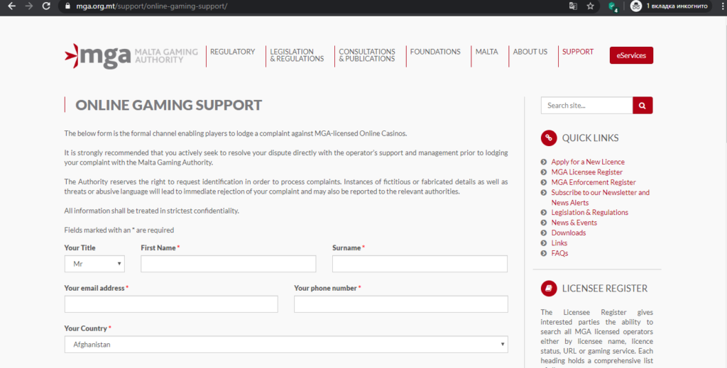 Переходим по ссылке https://www.mga.org.mt/support/online-gaming-support/ и заполняем форму. Далее ждем примерно пару недель ответа от лицензиара.
