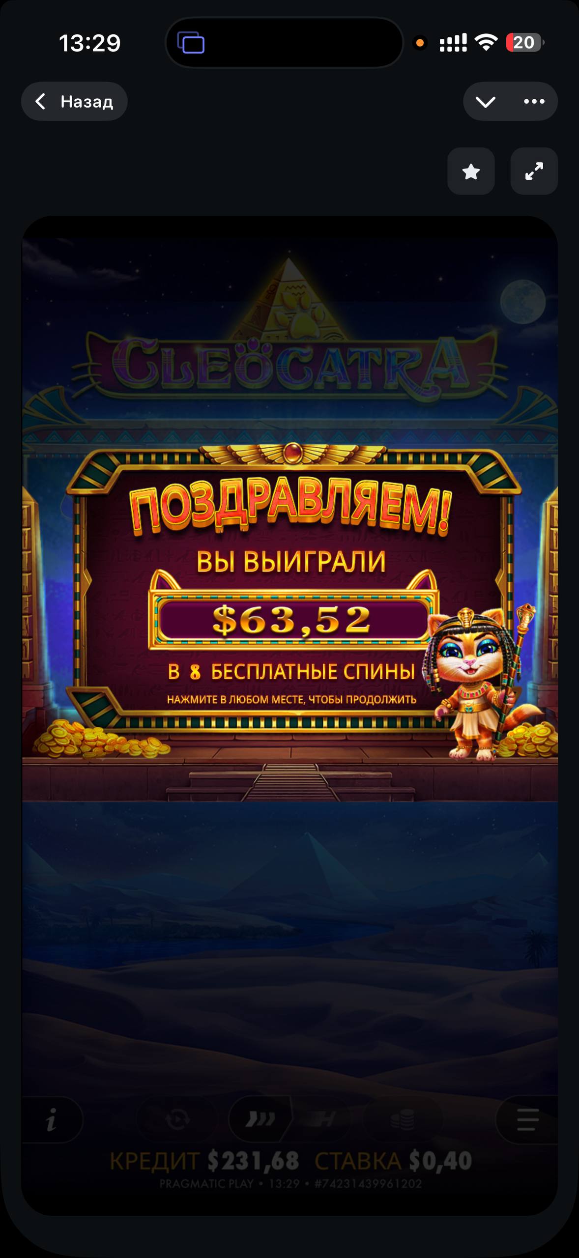 Всем привет! Сидел я как То другом в созвоне и крутил казино под демонстрацию экрана. Он мне сказал: «Иди в клеокатру сделай 50 спинов». Я решил довериться ему. Уже на 30 спине упала бонуска. Сразу начало ставить вилды и по несколько за спин. И к моему счастью на последнем спине сыграла полная линия кошек. Я был очень рад такому выигрышу в 63 доллара, и конечно же накинул другу за совет. Всем заносов!!!!