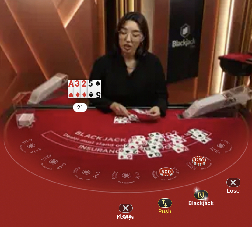 Когда остальные игроки закончили принимать свои решения, дилерша вскрывается и опять умудрилась собрать 21… А какая вообще разница, блэкджек у неё или нет, если даже без него она добирает его значение?)