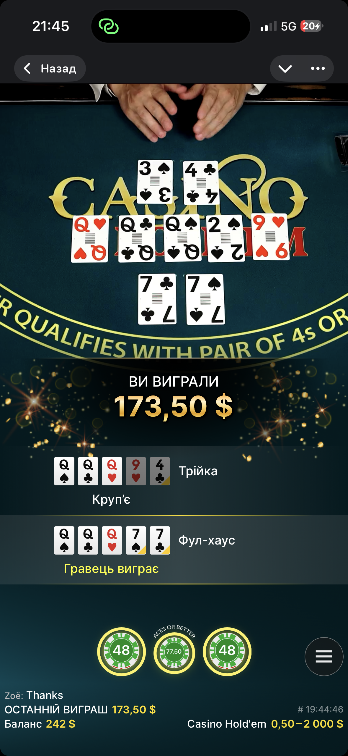 Далее на столе появляются 2 дамы, и я уже был очень рад, так как сыграл бонус, но когда дилер достал третью даму, то я был в полном шоке. В итоге дает фул хаус с раздачи, а это значит бонус не 8х, а целых 30, и выплата анте 4х. Считаю неплохой выигрыш с такой ставки.
