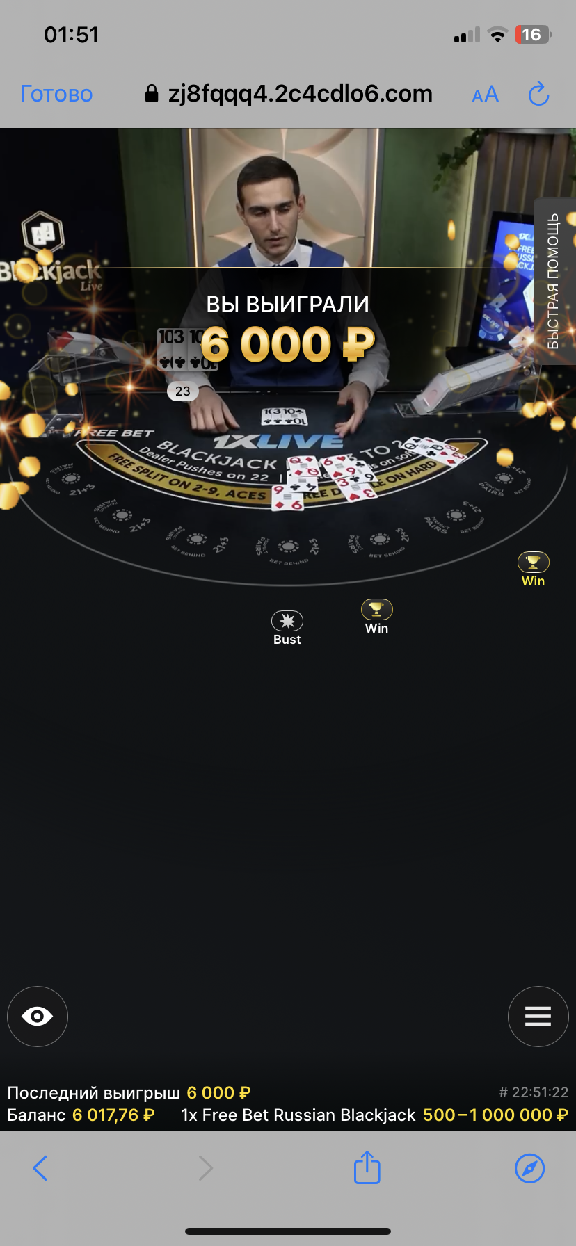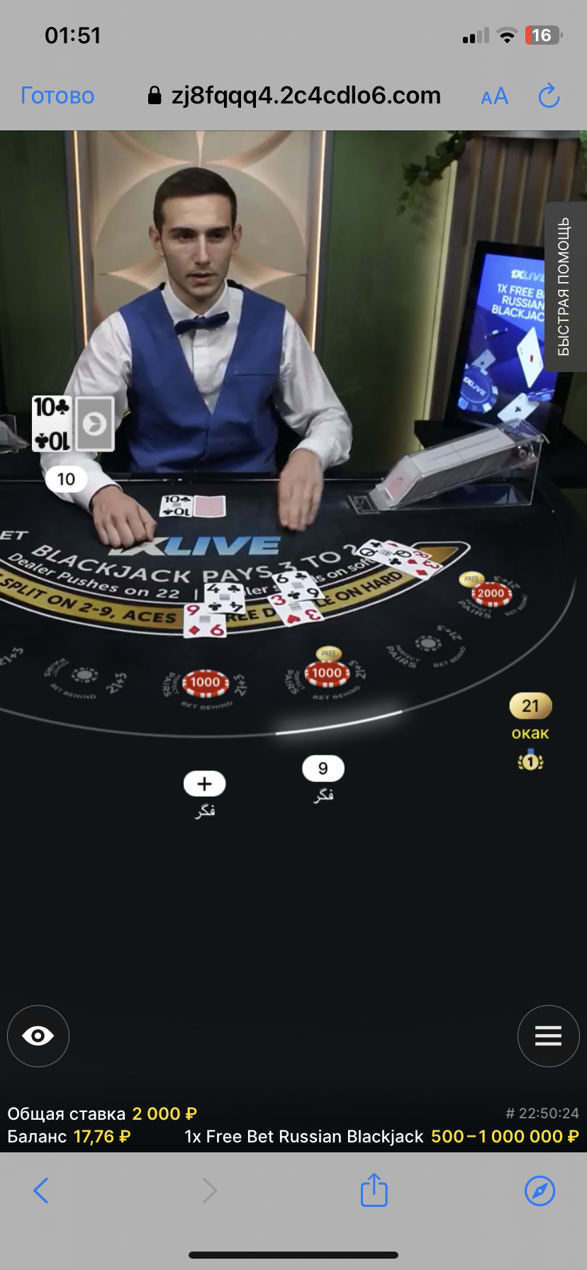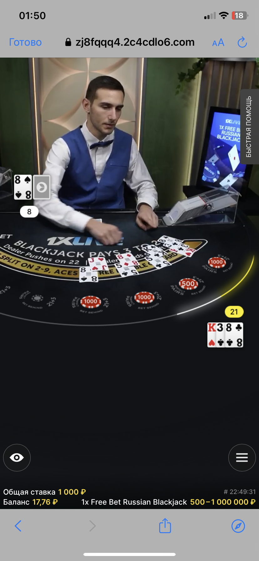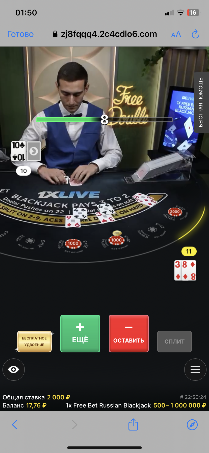 После непродолжительной сессии в лайвах баланс опустился до минимальных значений — до 1000 рублей, и я пошёл заниматься своим любимым делом: ставить ва-банк в блэкджеке, но не обычном, а «Free Bet» версии, где 22 у дилера — это ничья, но зато можно задаблить на 9, 10, 11 и засплитить за счёт казино.