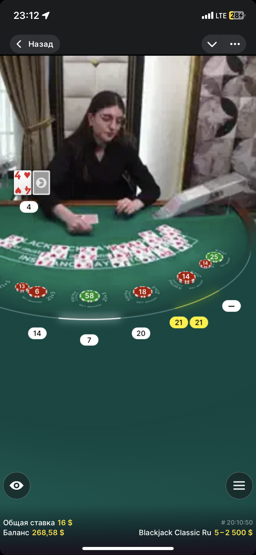 Сегодня я заигрался и решил пойти в Blackjack пробовать отмазаться. Начал с небольших ставок, где-то везло, где-то нет. Но в моменте мне выпала пара 10, я решил рискнуть и сделать сплит. На первой руке счёт 13, а на второй попался туз и это блэкджек. Долго думал, пока ползла моя очередь, добирать ли на 13. Решил всё-таки сделать хит, и он был очень удачным — ведь мне попалась восьмёрка, и вторая к ряду 21. Это было максимально неожиданно..