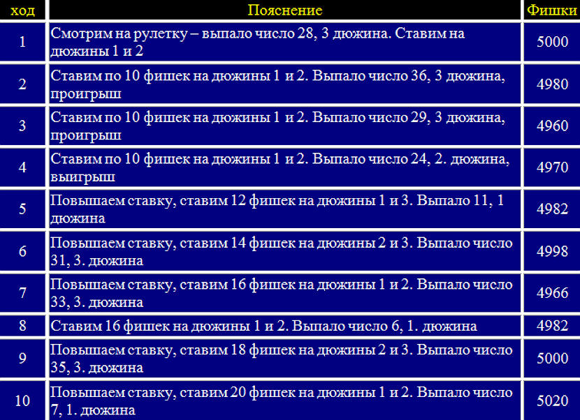 Ставки необходимо совершать на дюжины, находящиеся по соседству с той, которая победила в предыдущем вращении. Иногда такие дюжины называют параллельными. На каждую из двух таких дюжин ставится по десять фишек. В случае проигрыша ставка на две параллельные дюжины повторяется в том же размере. Если вращение оказалось удачным, то ставка возрастает на две фишки на каждой из двух дюжин. Ниже приведена таблица, в которой подробно расписан пример игры с использованием стратегии, рассчитанный на сорок два хода.