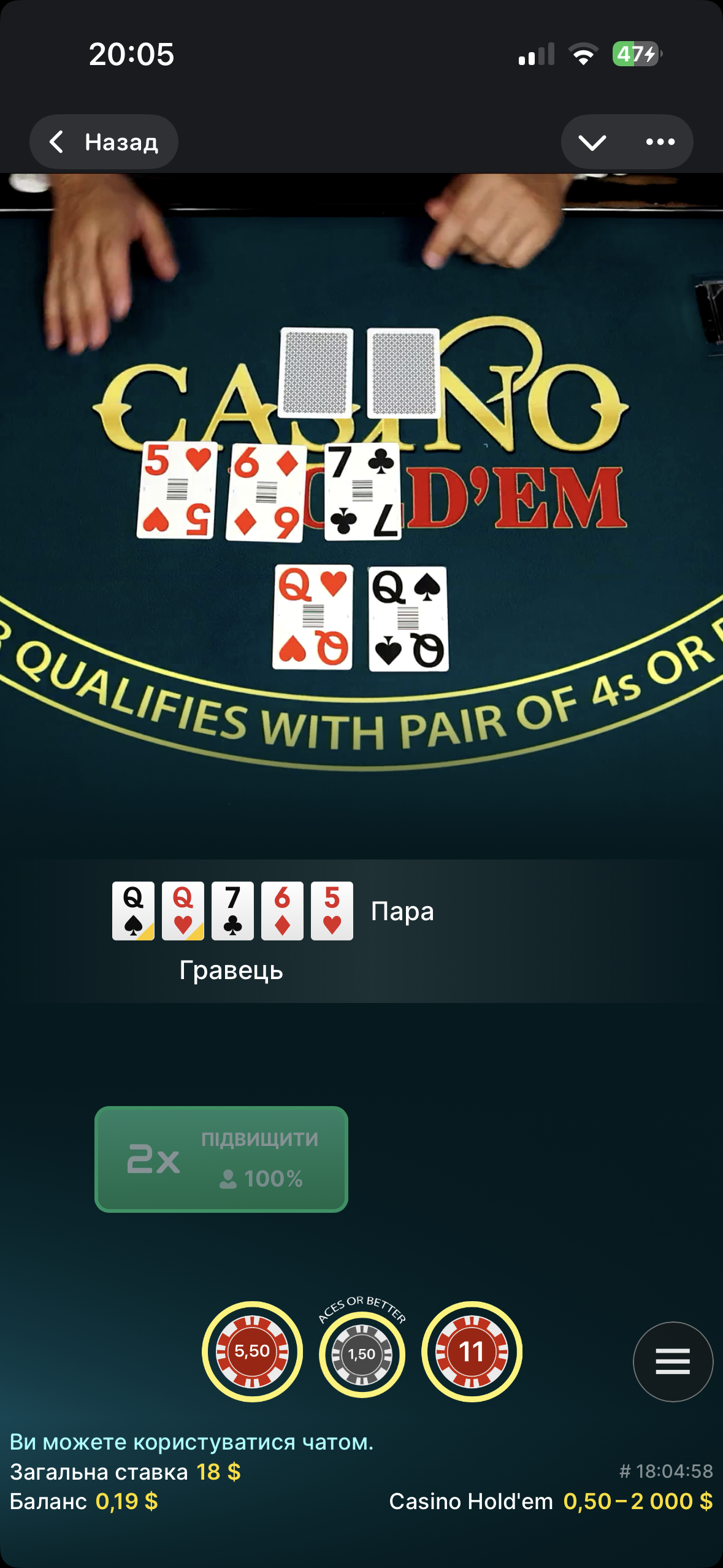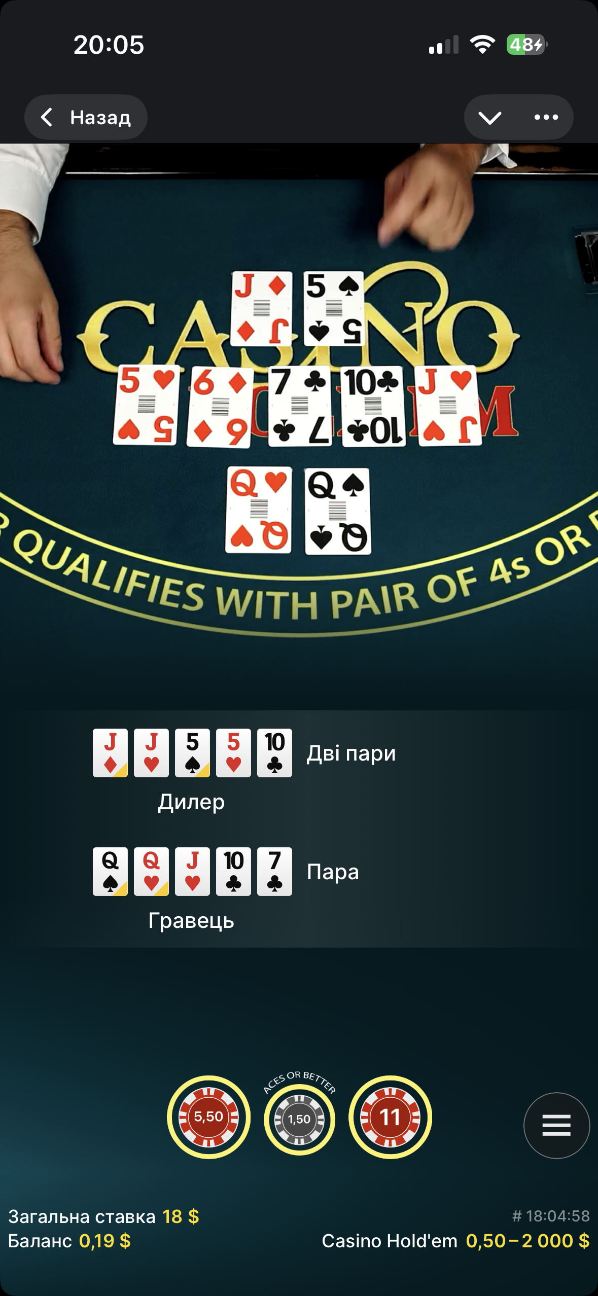 Играл покер, мне дало 2 дамы, что уже звучит неплохо, на столе 5 6 7, что не сильно радовало, но мой шанс на победу был довольно большой. Потом еще 2 карты на столе это 10 и валет, казалось бы что тут я точно должен был выиграть, потому что думал что у дилера максимум пара. Но у него оказывается 5 и валет, а это 2 пары и он выигрывает…