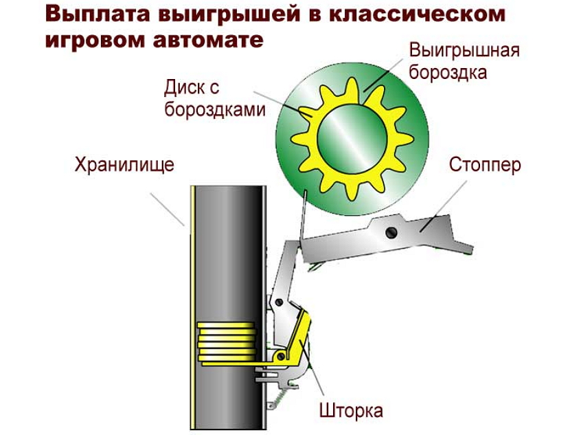 Если вы опустили деньги в специальный приемник, то они попадают в особое хранилище. На его дне находится специальный затвор, который соединен с металлическим устройством-шторкой. Большую часть времени это устройство держит затвор закрытым. Если выпал выигрыш, то гребешок-стоппер упирается в бороздку. Это приводит к поднятию стопорного механизма и соединительного устройства. Затвор приоткрывается, и монеты выпадают наружу.