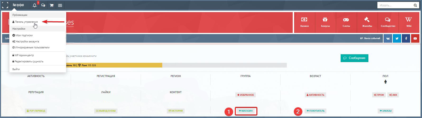 Еще один легкий способ попасть в магазин удачи Латеста – со странички управления своим аккаунтом. Для этого достаточно перейти в юзер-панель и в таблице с основной информацией о профиле нажать на кнопку «Магазин» (1). Смотрим скрин 3 ниже.