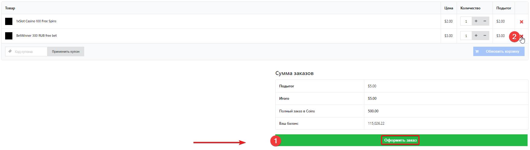 Если бонус покупался неоднократно и все условия его отыгрыша знакомы, совершить покупку можно быстро с главной страницы цифрового магазина и сразу перейти для оформления заказа в «Корзину».