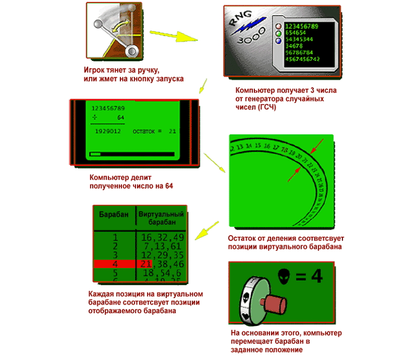 Рассмотрим в качестве примера игру на трехколесном слоте. Игрок нажимает на рычаг. Генератор мгновенно начинает перебирать числа. Три последних числа фиксируются. Их значения определяют положение первого, второго и третьего барабанов соответственно.