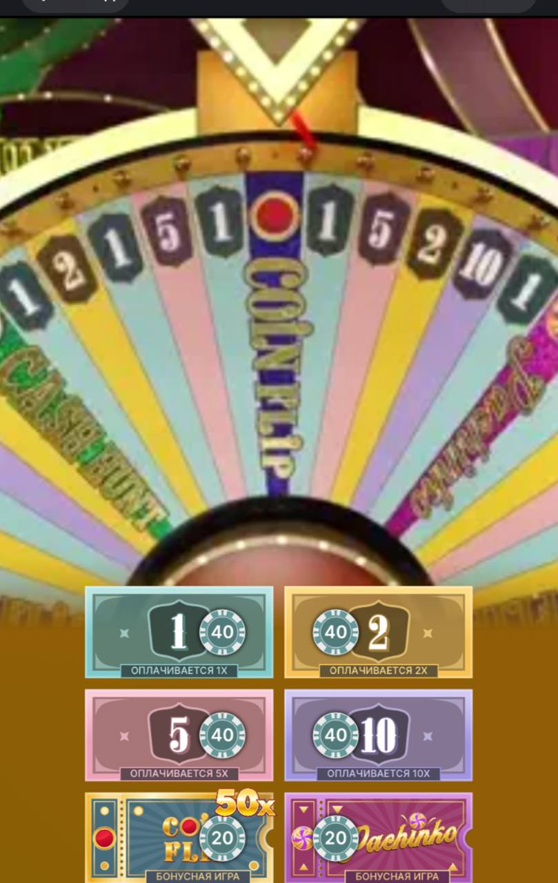 Когда я закончил обычными фриспинами, то пошёл в Крейзи тайм, и первой же ставкой мне адски не повезло: выпал дополнительный множитель на Coin Flip 50х — такое не каждый день здесь увидишь. И, как всегда, не докатило всего на один сектор до него:
