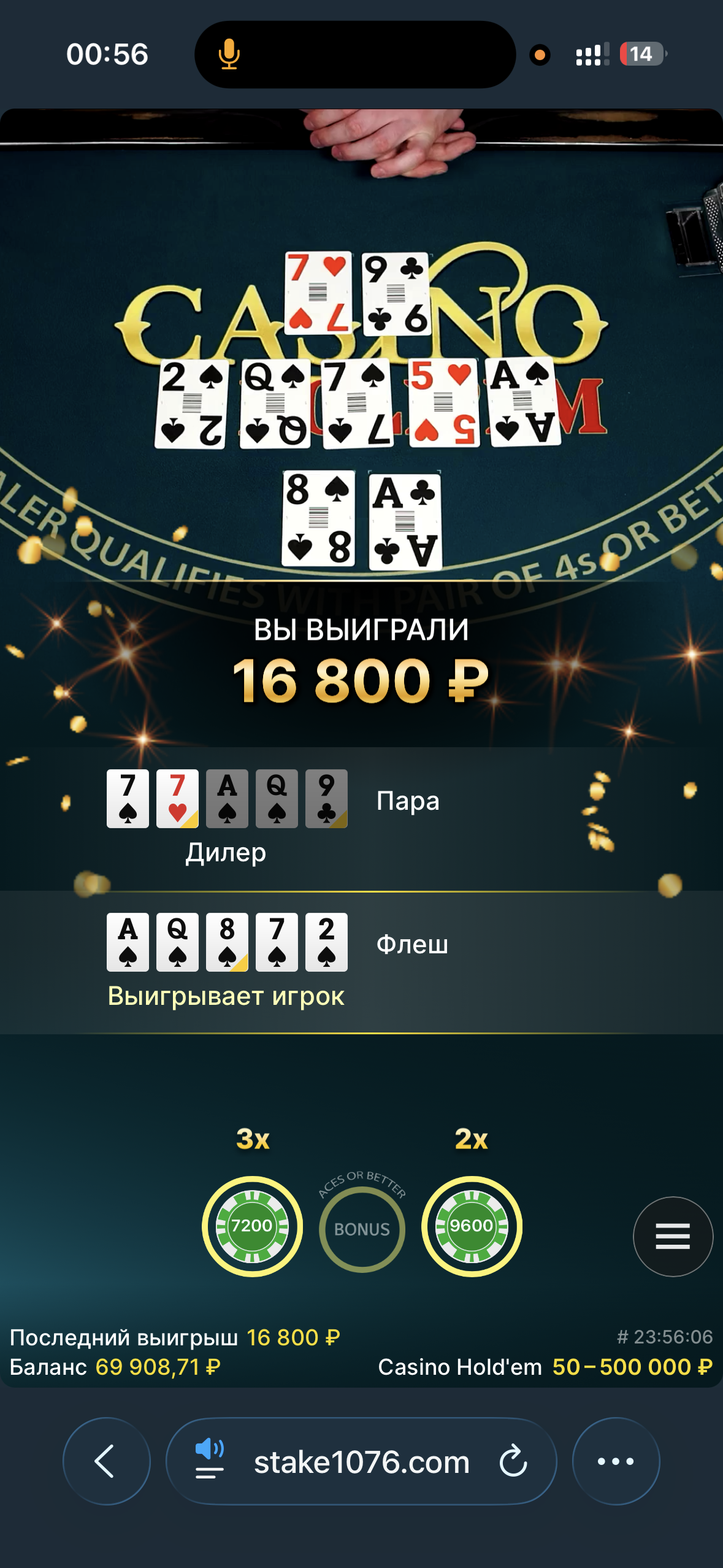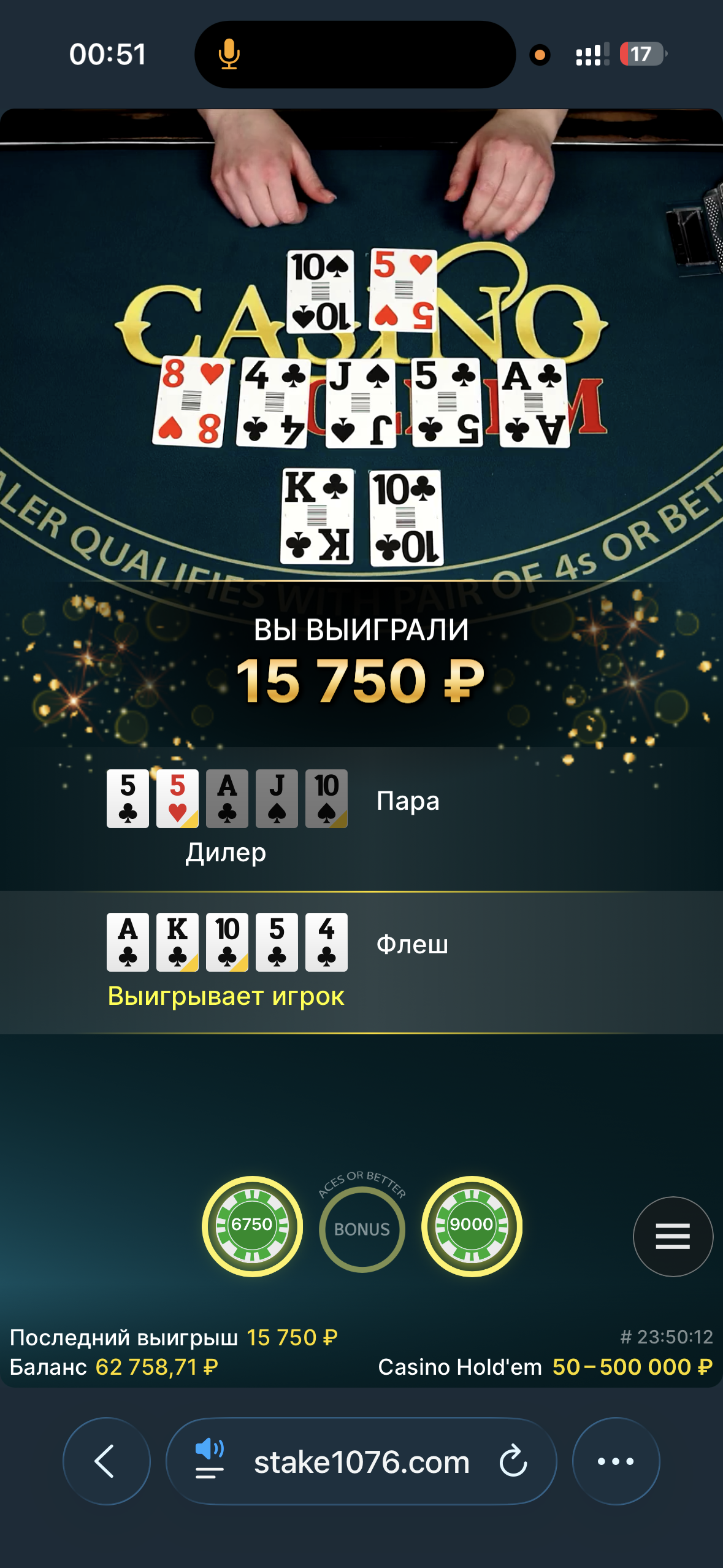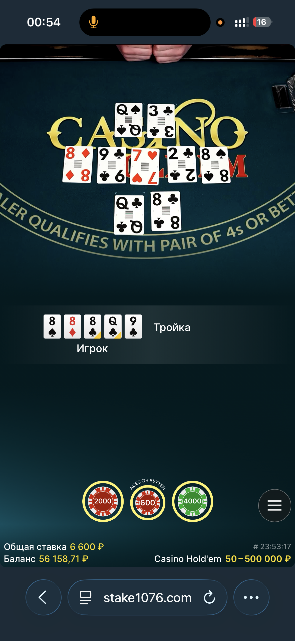 Стейк, баланс 51к. После кт пошел играть в покер, и не зря. Первая ставка 2000 и 600 на бонус. Бонус не дало, но дало пару 6, а в итоге 2 пары, а у диллера только 1 пара.