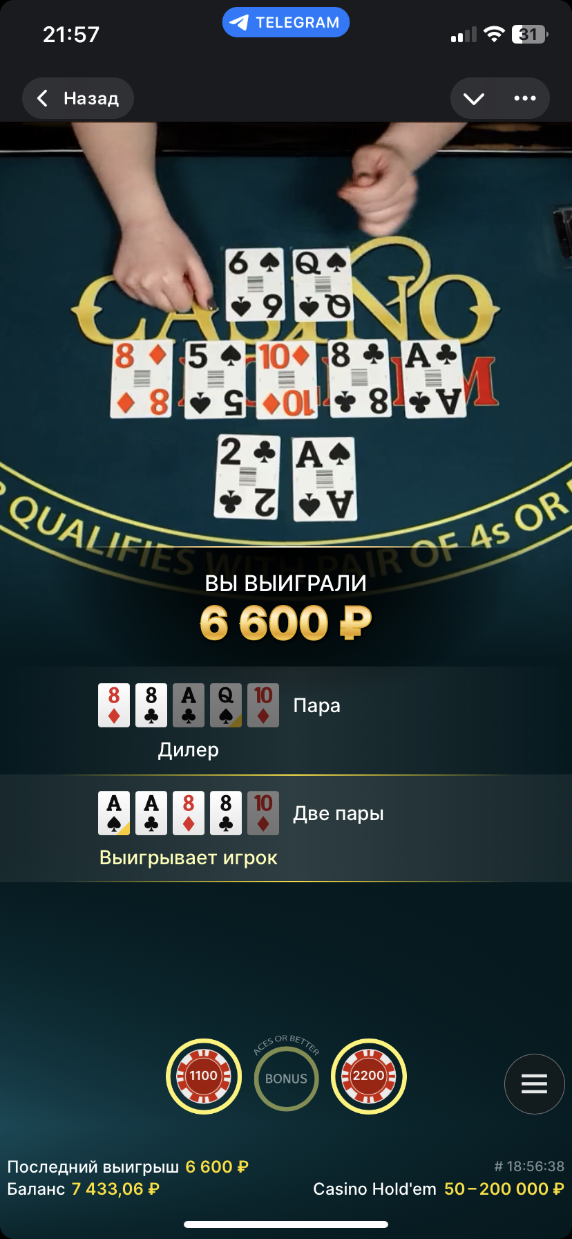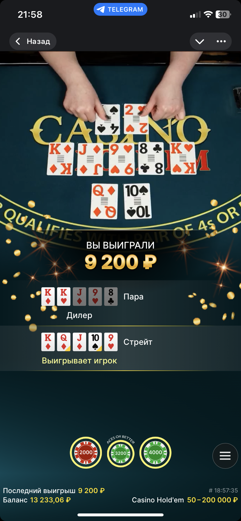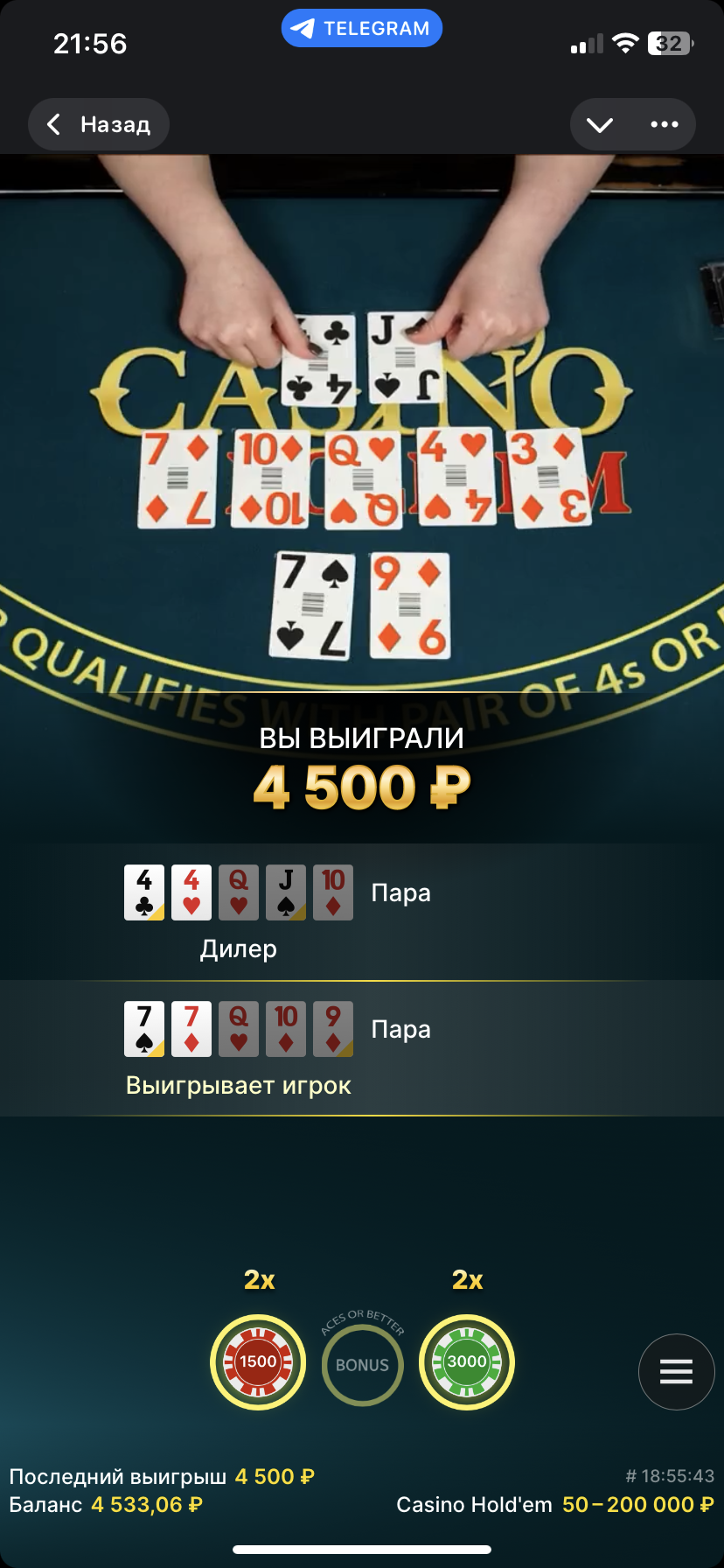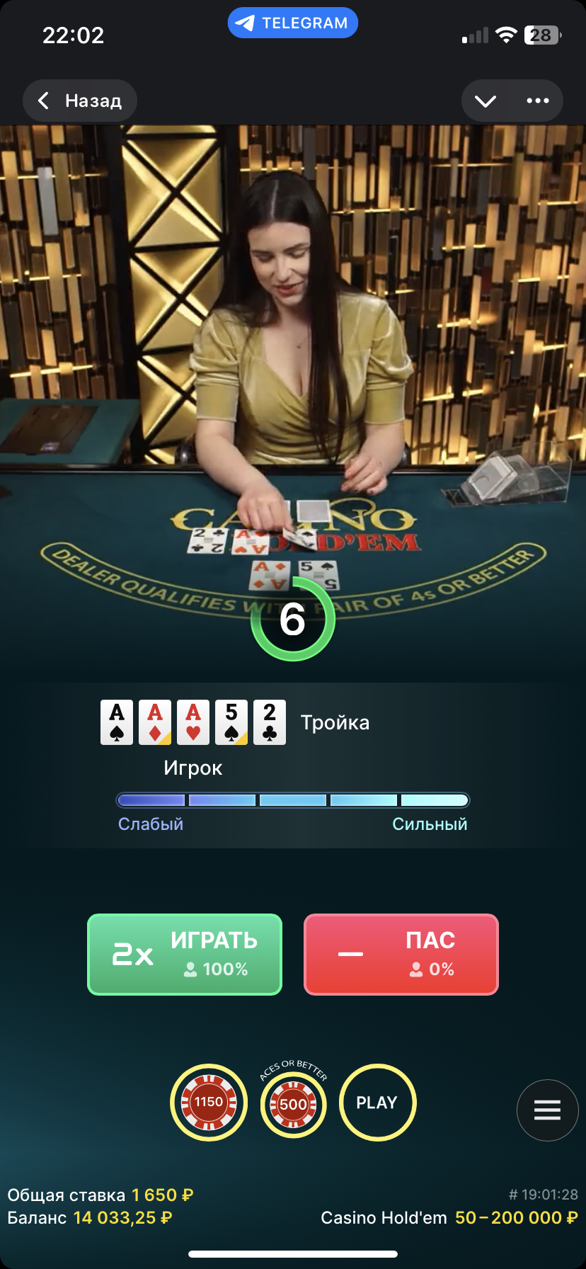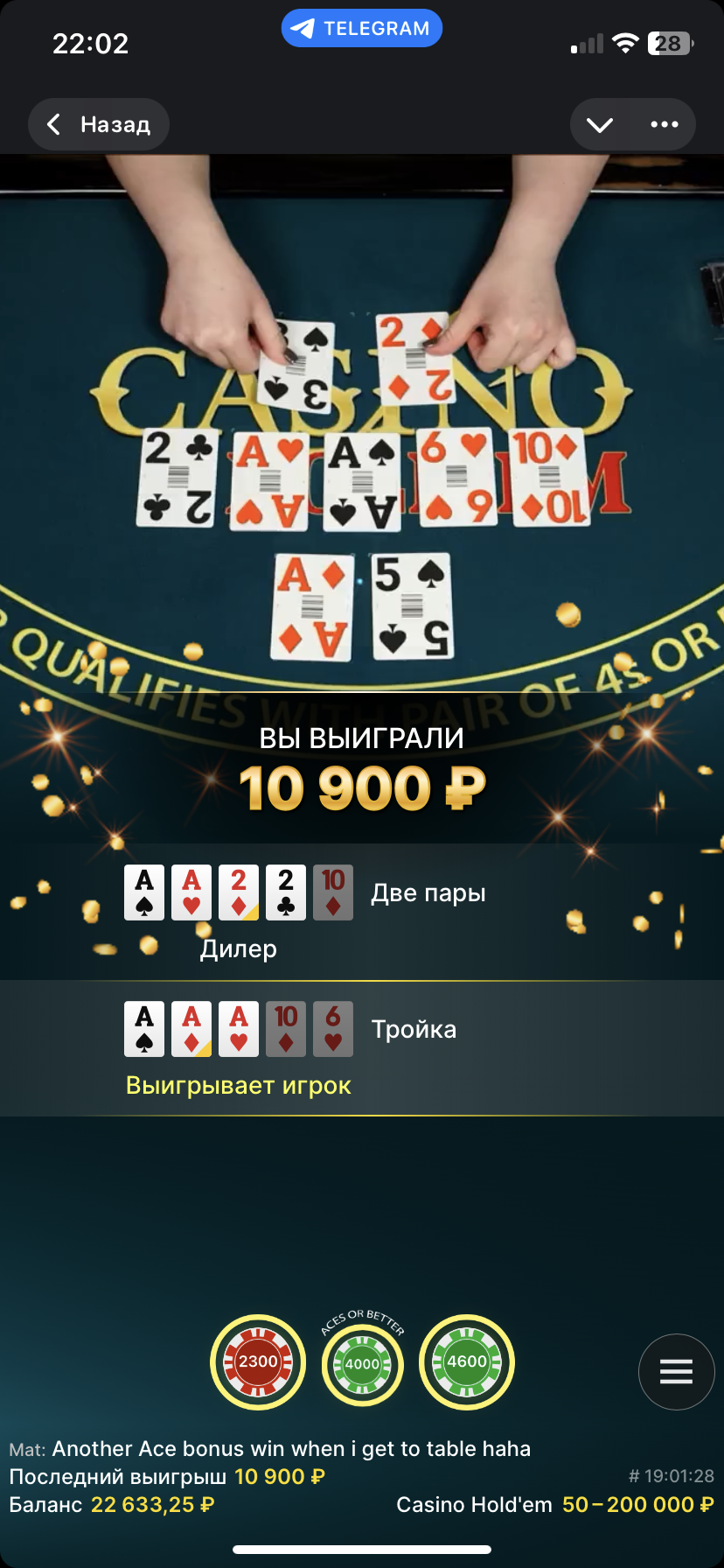 Коле не получилось камбэкнуться в блэкджеке, я пошёл в покер. Поставил на Анте 750 рублей — в случае «кола» списало бы ещё 1500 рублей, что обнулило бы мой текущий баланс 2250 рублей — all-in, в общем.
