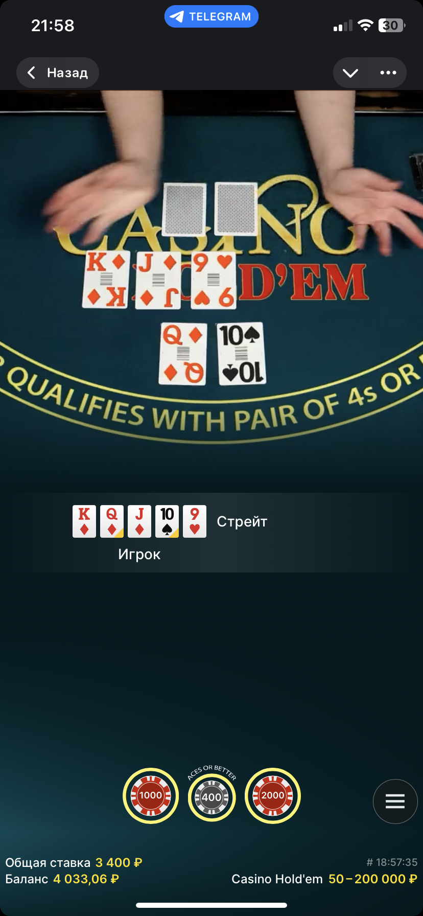 А дальше… Ставка 1000 на Анте, 400 на бонус, и наконец-то последний я поймал, когда ставка хорошая. Стрит на столе со флопа, отличный выигрыш! Вот чего я так долго ждал