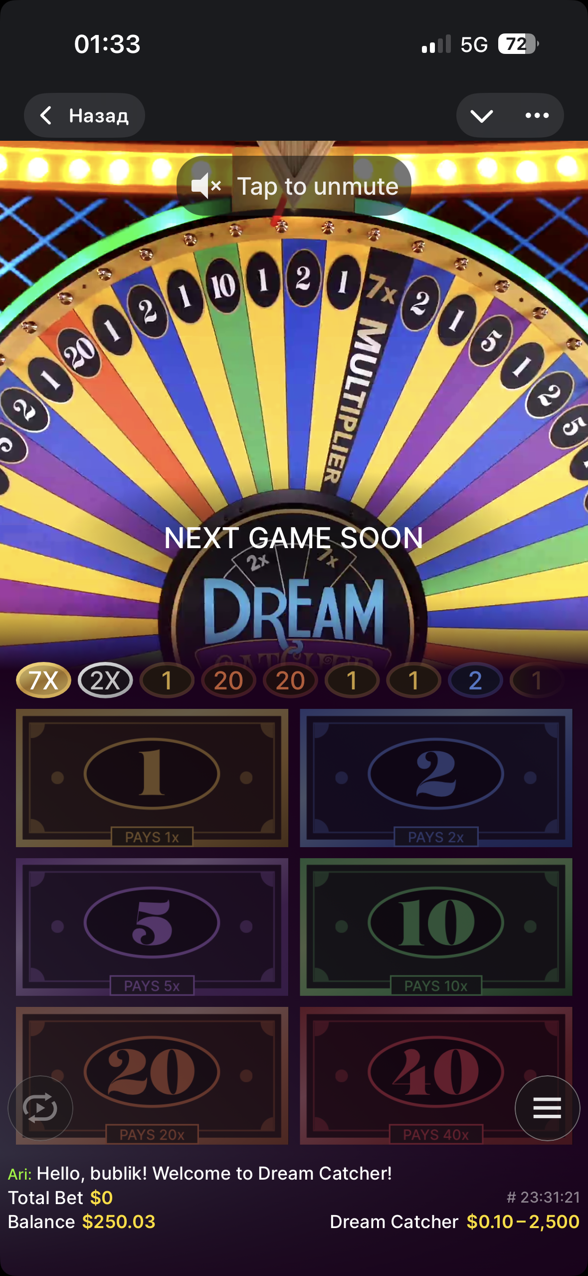 Зашёл в Dream catcher, просто чтобы сделать одну ставку — 125$ на 1 и 25$ на 10. Но, к сожалению, ничего не успел поставить.