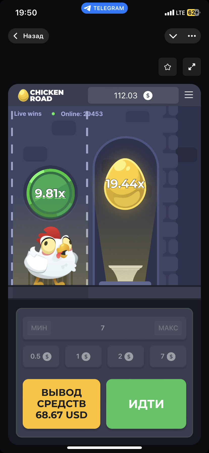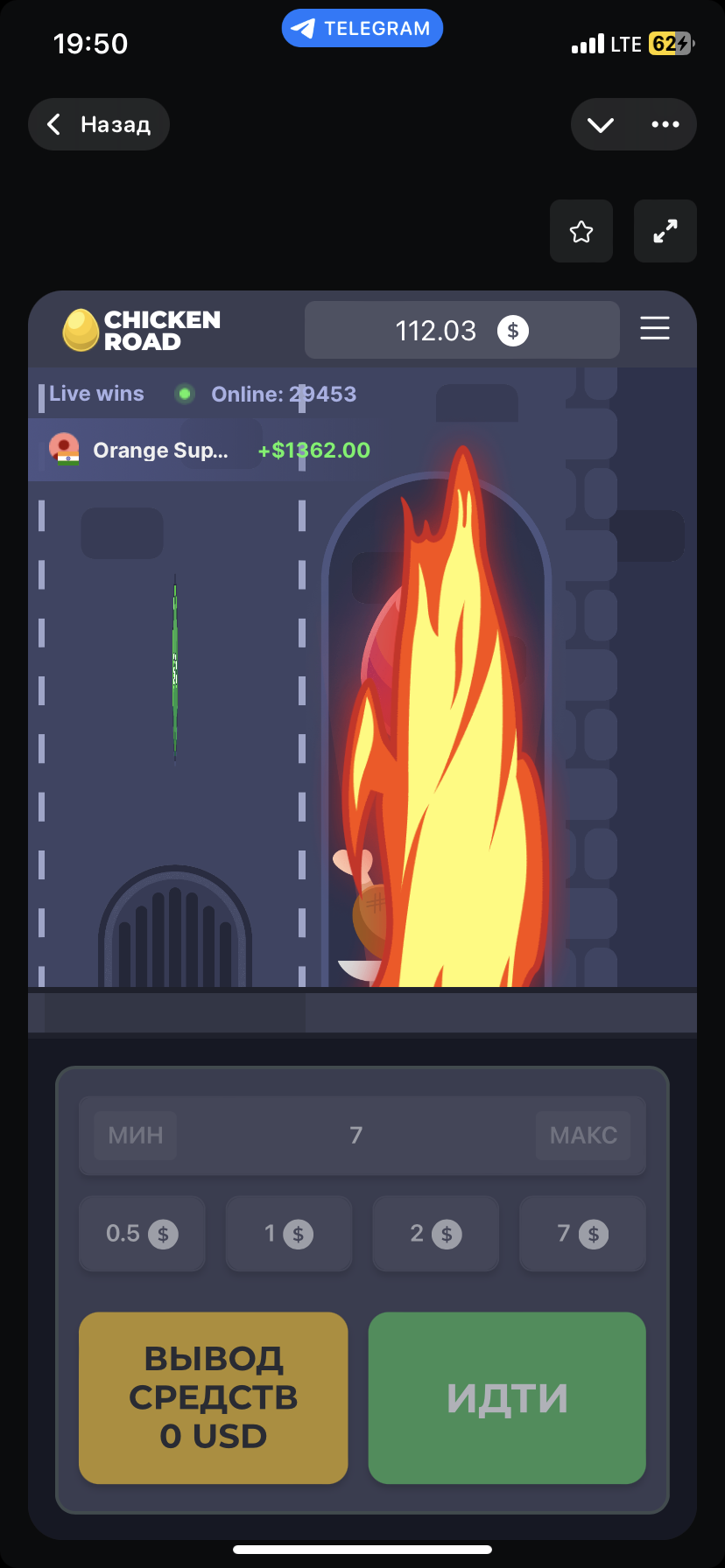 Есть такой, сугубо по моему мнению, самый дебильный и отбитый режим Chicken Road — эдакое разнообразие краш игр. В нём надо всего-то нажимать на кнопку и курочка будет двигаться и увеличивать множитель к ставке, но на любом ходе она непредсказуемо может поджариться и весь множитель сгорит.