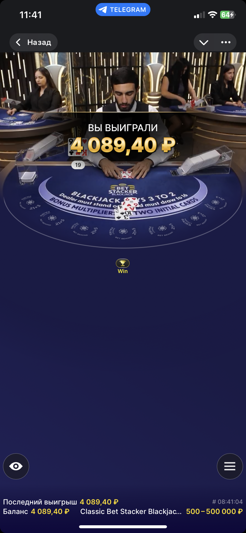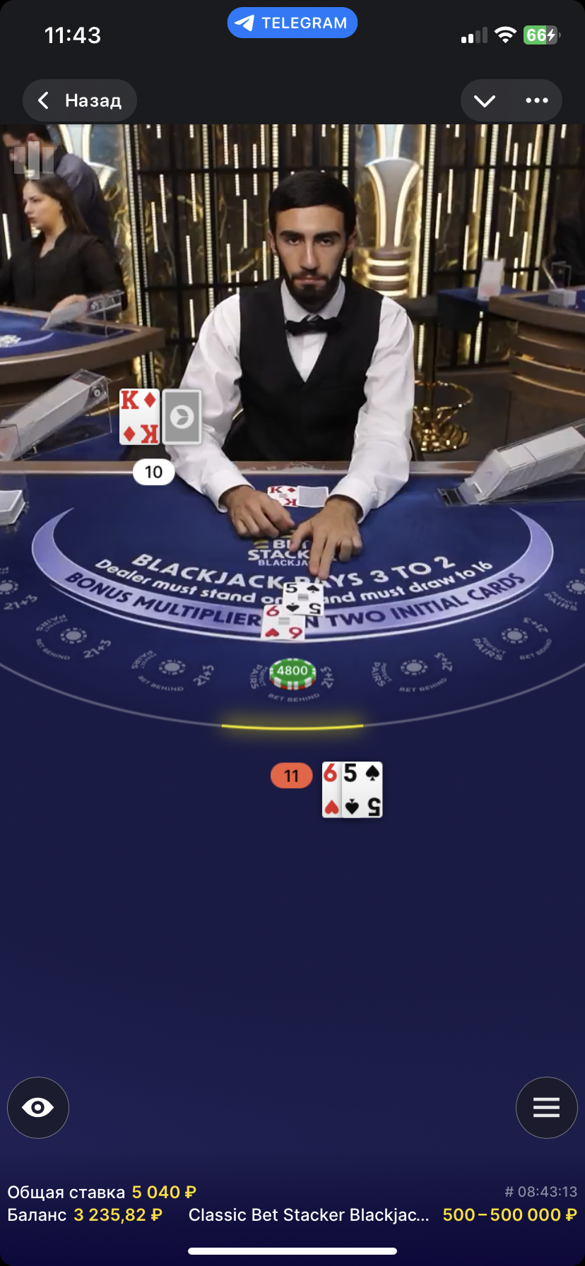 Первая ставка, счёт — 13. Выхода нет, у дилера десятка, в перебор не верится. Добрал две карты, и повезло — собрал 20 и не перебрал, обыграл дилера в одно очко. Эта зашла, и я пошёл дальше