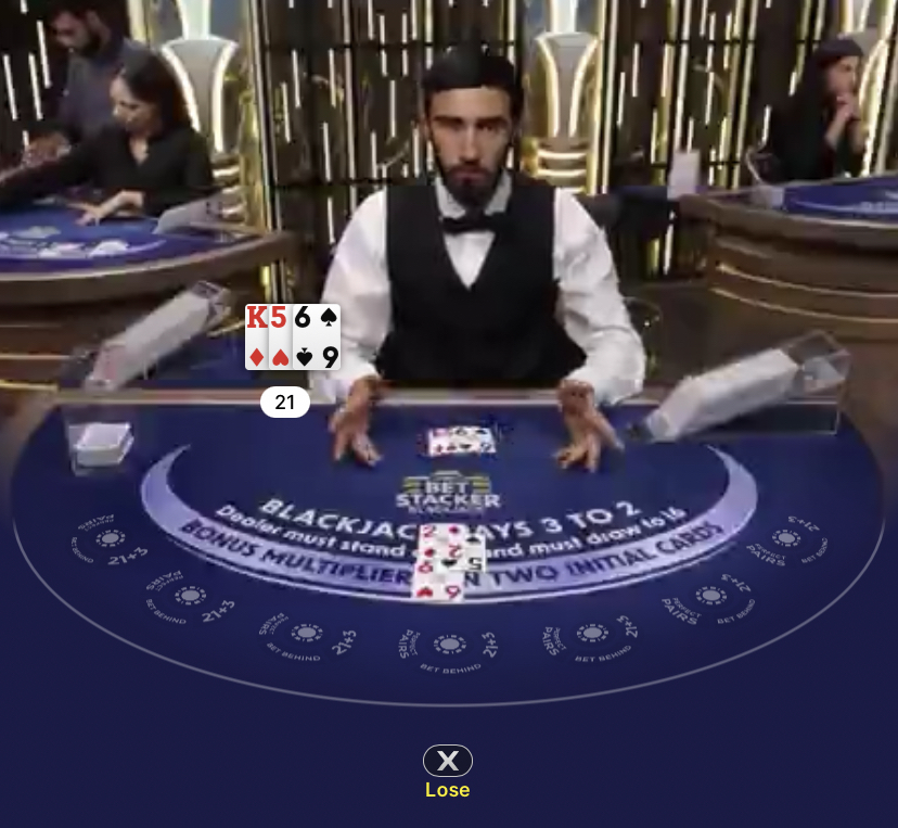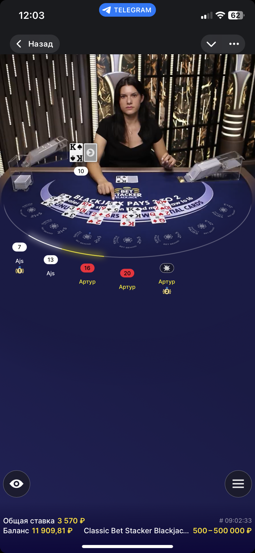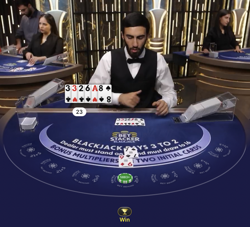 Мой баланс приблизился к критическому значению, и я решил пойти пытаться камбэкать его в блэкджек. Но в этот раз не в обычный, а с функцией Bet Stacker, и за общий стол с семью фаворитными боксами. Как говорится — «пошла возня!»
