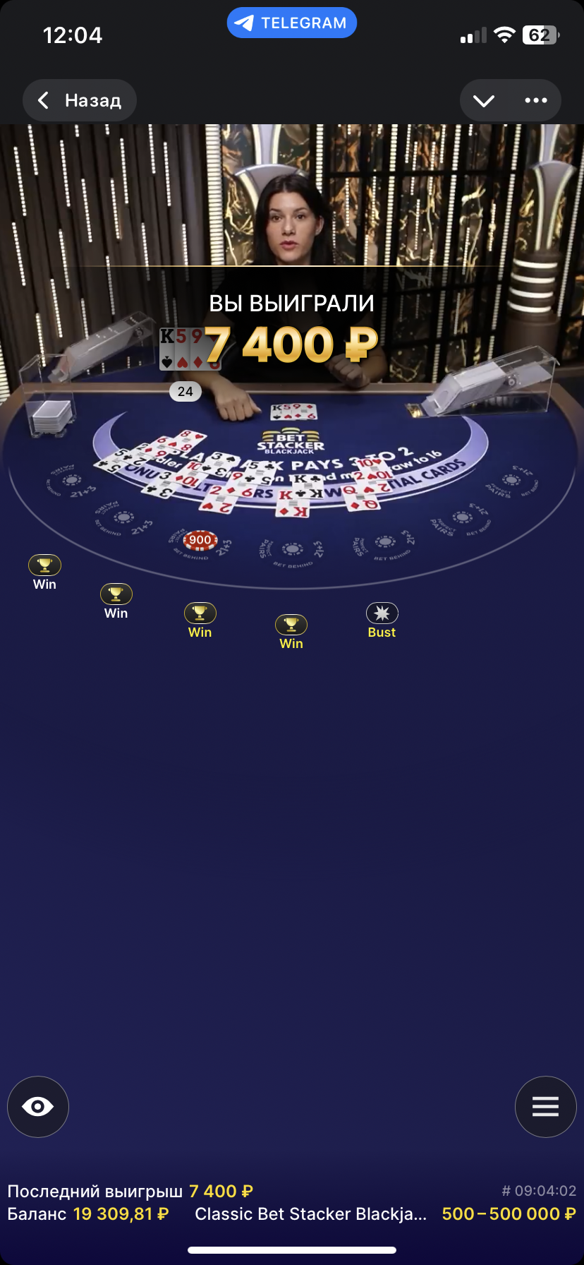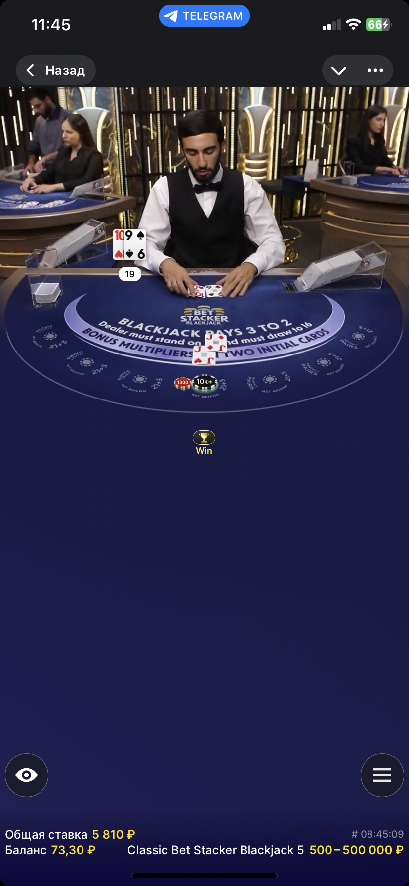 Счёт 15, у дилера опять 10… Ну тут уже чуйки на хороший добор не было, и пришлось остановиться. Хорошо, что я это сделал, ведь дилер успешно перебрал с десятки, и я выиграл.