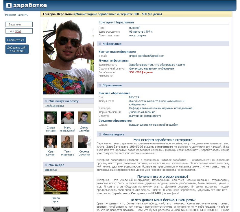 Этот человек является создателем сразу нескольких «серых» сайтов. Минимум два из них (vzarabotke.ru и vmesterabotaem.ru) уже прекратили существовать. На обоих сайтах утверждалось, что система Мартингейла работает безотказно, но применять ее нужно только в конкретных казино. Далее приводились списки игорных заведений.