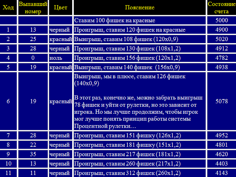 Выгода данной стратегии заключается в том, что учитываются математические особенности рулетки. Известно, что в европейской рулетке заведение имеет преимущество в 2,7%. «Процентная рулетка» снижает это значение путем постоянной смены размера ставок. Пример игры подробно рассмотрен в таблице.