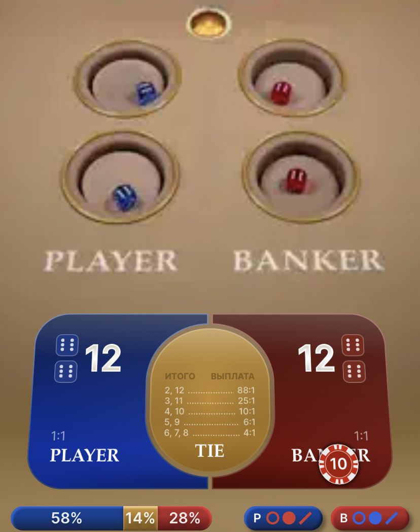 В итоге, плееру выпала общая сумма двух костей 12, и банкиру вслед за ним, что случается здесь очень редко. А выплата за такой исход составляет аж целых 88:1!!! Если бы я поставил хотябы 1$ на ничью — был бы отличный занос вместе с возвратом ставки, но в этот раз очень не повезло, и мне досталось только последнее( Очень тяжело было это видеть